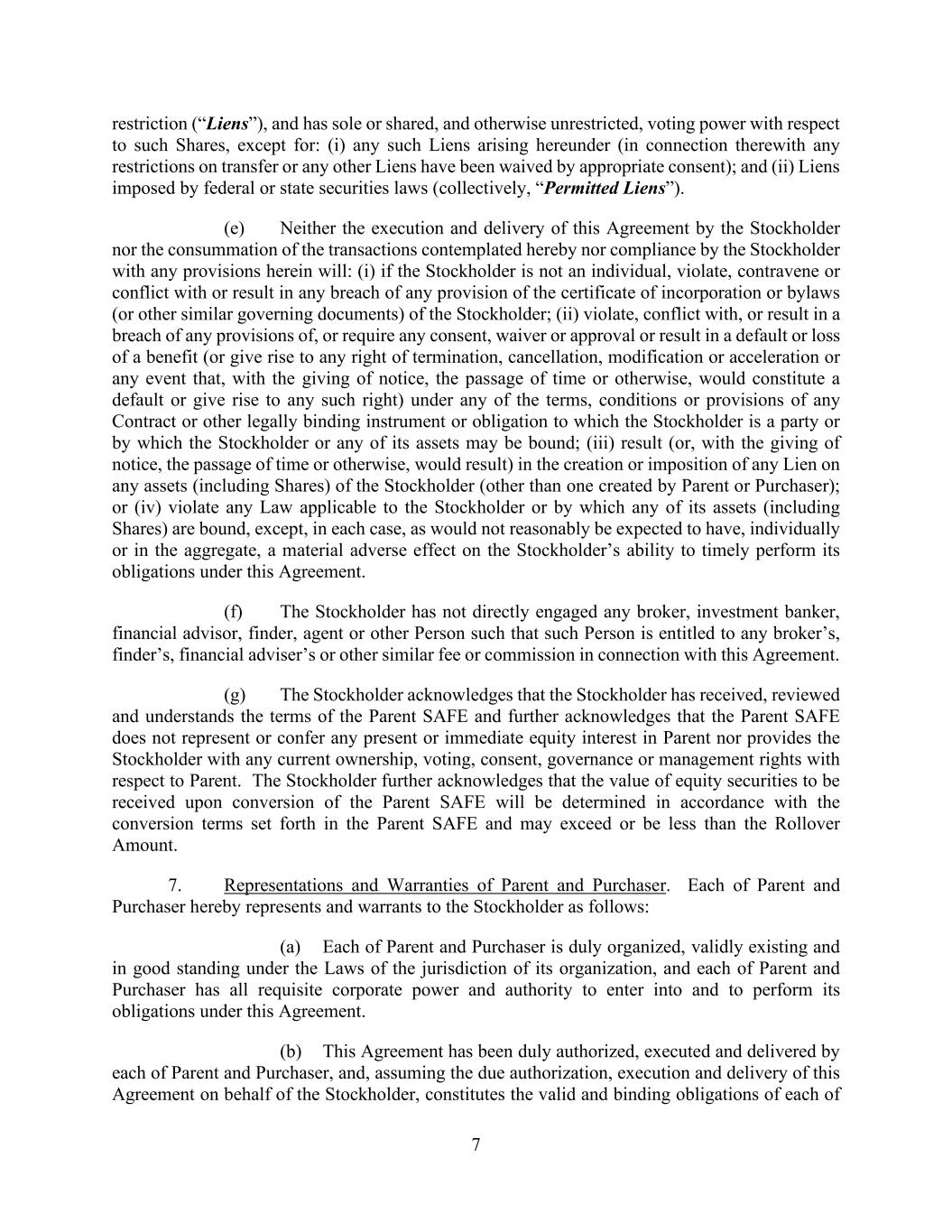 7 restriction (“Liens”), and has sole or shared, and otherwise unrestricted, voting power with respect to such Shares, except for: (i) any such Liens arising hereunder (in connection therewith any restrictions on transfer or any other Liens have been waived by appropriate consent); and (ii) Liens imposed by federal or state securities laws (collectively, “Permitted Liens”). (e) Neither the execution and delivery of this Agreement by the Stockholder nor the consummation of the transactions contemplated hereby nor compliance by the Stockholder with any provisions herein will: (i) if the Stockholder is not an individual, violate, contravene or conflict with or result in any breach of any provision of the certificate of incorporation or bylaws (or other similar governing documents) of the Stockholder; (ii) violate, conflict with, or result in a breach of any provisions of, or require any consent, waiver or approval or result in a default or loss of a benefit (or give rise to any right of termination, cancellation, modification or acceleration or any event that, with the giving of notice, the passage of time or otherwise, would constitute a default or give rise to any such right) under any of the terms, conditions or provisions of any Contract or other legally binding instrument or obligation to which the Stockholder is a party or by which the Stockholder or any of its assets may be bound; (iii) result (or, with the giving of notice, the passage of time or otherwise, would result) in the creation or imposition of any Lien on any assets (including Shares) of the Stockholder (other than one created by Parent or Purchaser); or (iv) violate any Law applicable to the Stockholder or by which any of its assets (including Shares) are bound, except, in each case, as would not reasonably be expected to have, individually or in the aggregate, a material adverse effect on the Stockholder’s ability to timely perform its obligations under this Agreement. (f) The Stockholder has not directly engaged any broker, investment banker, financial advisor, finder, agent or other Person such that such Person is entitled to any broker’s, finder’s, financial adviser’s or other similar fee or commission in connection with this Agreement. (g) The Stockholder acknowledges that the Stockholder has received, reviewed and understands the terms of the Parent SAFE and further acknowledges that the Parent SAFE does not represent or confer any present or immediate equity interest in Parent nor provides the Stockholder with any current ownership, voting, consent, governance or management rights with respect to Parent. The Stockholder further acknowledges that the value of equity securities to be received upon conversion of the Parent SAFE will be determined in accordance with the conversion terms set forth in the Parent SAFE and may exceed or be less than the Rollover Amount. 7. Representations and Warranties of Parent and Purchaser. Each of Parent and Purchaser hereby represents and warrants to the Stockholder as follows: (a) Each of Parent and Purchaser is duly organized, validly existing and in good standing under the Laws of the jurisdiction of its organization, and each of Parent and Purchaser has all requisite corporate power and authority to enter into and to perform its obligations under this Agreement. (b) This Agreement has been duly authorized, executed and delivered by each of Parent and Purchaser, and, assuming the due authorization, execution and delivery of this Agreement on behalf of the Stockholder, constitutes the valid and binding obligations of each of