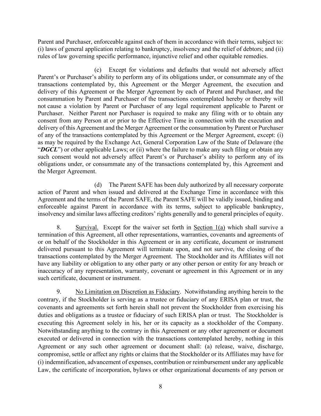 8 Parent and Purchaser, enforceable against each of them in accordance with their terms, subject to: (i) laws of general application relating to bankruptcy, insolvency and the relief of debtors; and (ii) rules of law governing specific performance, injunctive relief and other equitable remedies. (c) Except for violations and defaults that would not adversely affect Parent’s or Purchaser’s ability to perform any of its obligations under, or consummate any of the transactions contemplated by, this Agreement or the Merger Agreement, the execution and delivery of this Agreement or the Merger Agreement by each of Parent and Purchaser, and the consummation by Parent and Purchaser of the transactions contemplated hereby or thereby will not cause a violation by Parent or Purchaser of any legal requirement applicable to Parent or Purchaser. Neither Parent nor Purchaser is required to make any filing with or to obtain any consent from any Person at or prior to the Effective Time in connection with the execution and delivery of this Agreement and the Merger Agreement or the consummation by Parent or Purchaser of any of the transactions contemplated by this Agreement or the Merger Agreement, except: (i) as may be required by the Exchange Act, General Corporation Law of the State of Delaware (the “DGCL”) or other applicable Laws; or (ii) where the failure to make any such filing or obtain any such consent would not adversely affect Parent’s or Purchaser’s ability to perform any of its obligations under, or consummate any of the transactions contemplated by, this Agreement and the Merger Agreement. (d) The Parent SAFE has been duly authorized by all necessary corporate action of Parent and when issued and delivered at the Exchange Time in accordance with this Agreement and the terms of the Parent SAFE, the Parent SAFE will be validly issued, binding and enforceable against Parent in accordance with its terms, subject to applicable bankruptcy, insolvency and similar laws affecting creditors’ rights generally and to general principles of equity. 8. Survival. Except for the waiver set forth in Section 1(a) which shall survive a termination of this Agreement, all other representations, warranties, covenants and agreements of or on behalf of the Stockholder in this Agreement or in any certificate, document or instrument delivered pursuant to this Agreement will terminate upon, and not survive, the closing of the transactions contemplated by the Merger Agreement. The Stockholder and its Affiliates will not have any liability or obligation to any other party or any other person or entity for any breach or inaccuracy of any representation, warranty, covenant or agreement in this Agreement or in any such certificate, document or instrument. 9. No Limitation on Discretion as Fiduciary. Notwithstanding anything herein to the contrary, if the Stockholder is serving as a trustee or fiduciary of any ERISA plan or trust, the covenants and agreements set forth herein shall not prevent the Stockholder from exercising his duties and obligations as a trustee or fiduciary of such ERISA plan or trust. The Stockholder is executing this Agreement solely in his, her or its capacity as a stockholder of the Company. Notwithstanding anything to the contrary in this Agreement or any other agreement or document executed or delivered in connection with the transactions contemplated hereby, nothing in this Agreement or any such other agreement or document shall: (a) release, waive, discharge, compromise, settle or affect any rights or claims that the Stockholder or its Affiliates may have for (i) indemnification, advancement of expenses, contribution or reimbursement under any applicable Law, the certificate of incorporation, bylaws or other organizational documents of any person or