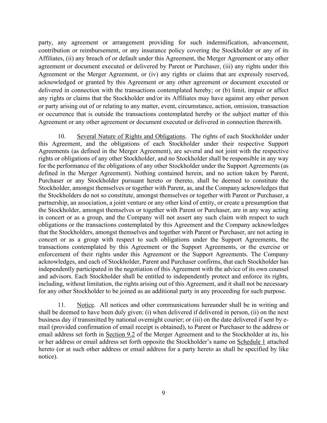 9 party, any agreement or arrangement providing for such indemnification, advancement, contribution or reimbursement, or any insurance policy covering the Stockholder or any of its Affiliates, (ii) any breach of or default under this Agreement, the Merger Agreement or any other agreement or document executed or delivered by Parent or Purchaser, (iii) any rights under this Agreement or the Merger Agreement, or (iv) any rights or claims that are expressly reserved, acknowledged or granted by this Agreement or any other agreement or document executed or delivered in connection with the transactions contemplated hereby; or (b) limit, impair or affect any rights or claims that the Stockholder and/or its Affiliates may have against any other person or party arising out of or relating to any matter, event, circumstance, action, omission, transaction or occurrence that is outside the transactions contemplated hereby or the subject matter of this Agreement or any other agreement or document executed or delivered in connection therewith. 10. Several Nature of Rights and Obligations. The rights of each Stockholder under this Agreement, and the obligations of each Stockholder under their respective Support Agreements (as defined in the Merger Agreement), are several and not joint with the respective rights or obligations of any other Stockholder, and no Stockholder shall be responsible in any way for the performance of the obligations of any other Stockholder under the Support Agreements (as defined in the Merger Agreement). Nothing contained herein, and no action taken by Parent, Purchaser or any Stockholder pursuant hereto or thereto, shall be deemed to constitute the Stockholder, amongst themselves or together with Parent, as, and the Company acknowledges that the Stockholders do not so constitute, amongst themselves or together with Parent or Purchaser, a partnership, an association, a joint venture or any other kind of entity, or create a presumption that the Stockholder, amongst themselves or together with Parent or Purchaser, are in any way acting in concert or as a group, and the Company will not assert any such claim with respect to such obligations or the transactions contemplated by this Agreement and the Company acknowledges that the Stockholders, amongst themselves and together with Parent or Purchaser, are not acting in concert or as a group with respect to such obligations under the Support Agreements, the transactions contemplated by this Agreement or the Support Agreements, or the exercise or enforcement of their rights under this Agreement or the Support Agreements. The Company acknowledges, and each of Stockholder, Parent and Purchaser confirms, that each Stockholder has independently participated in the negotiation of this Agreement with the advice of its own counsel and advisors. Each Stockholder shall be entitled to independently protect and enforce its rights, including, without limitation, the rights arising out of this Agreement, and it shall not be necessary for any other Stockholder to be joined as an additional party in any proceeding for such purpose. 11. Notice. All notices and other communications hereunder shall be in writing and shall be deemed to have been duly given: (i) when delivered if delivered in person, (ii) on the next business day if transmitted by national overnight courier; or (iii) on the date delivered if sent by e- mail (provided confirmation of email receipt is obtained), to Parent or Purchaser to the address or email address set forth in Section 9.2 of the Merger Agreement and to the Stockholder at its, his or her address or email address set forth opposite the Stockholder’s name on Schedule 1 attached hereto (or at such other address or email address for a party hereto as shall be specified by like notice).