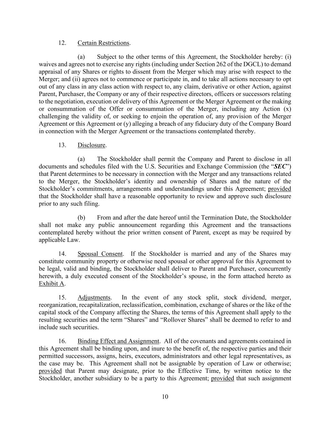 10 12. Certain Restrictions. (a) Subject to the other terms of this Agreement, the Stockholder hereby: (i) waives and agrees not to exercise any rights (including under Section 262 of the DGCL) to demand appraisal of any Shares or rights to dissent from the Merger which may arise with respect to the Merger; and (ii) agrees not to commence or participate in, and to take all actions necessary to opt out of any class in any class action with respect to, any claim, derivative or other Action, against Parent, Purchaser, the Company or any of their respective directors, officers or successors relating to the negotiation, execution or delivery of this Agreement or the Merger Agreement or the making or consummation of the Offer or consummation of the Merger, including any Action (x) challenging the validity of, or seeking to enjoin the operation of, any provision of the Merger Agreement or this Agreement or (y) alleging a breach of any fiduciary duty of the Company Board in connection with the Merger Agreement or the transactions contemplated thereby. 13. Disclosure. (a) The Stockholder shall permit the Company and Parent to disclose in all documents and schedules filed with the U.S. Securities and Exchange Commission (the “SEC”) that Parent determines to be necessary in connection with the Merger and any transactions related to the Merger, the Stockholder’s identity and ownership of Shares and the nature of the Stockholder’s commitments, arrangements and understandings under this Agreement; provided that the Stockholder shall have a reasonable opportunity to review and approve such disclosure prior to any such filing. (b) From and after the date hereof until the Termination Date, the Stockholder shall not make any public announcement regarding this Agreement and the transactions contemplated hereby without the prior written consent of Parent, except as may be required by applicable Law. 14. Spousal Consent. If the Stockholder is married and any of the Shares may constitute community property or otherwise need spousal or other approval for this Agreement to be legal, valid and binding, the Stockholder shall deliver to Parent and Purchaser, concurrently herewith, a duly executed consent of the Stockholder’s spouse, in the form attached hereto as Exhibit A. 15. Adjustments. In the event of any stock split, stock dividend, merger, reorganization, recapitalization, reclassification, combination, exchange of shares or the like of the capital stock of the Company affecting the Shares, the terms of this Agreement shall apply to the resulting securities and the term “Shares” and “Rollover Shares” shall be deemed to refer to and include such securities. 16. Binding Effect and Assignment. All of the covenants and agreements contained in this Agreement shall be binding upon, and inure to the benefit of, the respective parties and their permitted successors, assigns, heirs, executors, administrators and other legal representatives, as the case may be. This Agreement shall not be assignable by operation of Law or otherwise; provided that Parent may designate, prior to the Effective Time, by written notice to the Stockholder, another subsidiary to be a party to this Agreement; provided that such assignment