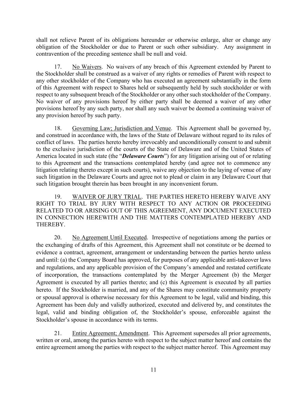 11 shall not relieve Parent of its obligations hereunder or otherwise enlarge, alter or change any obligation of the Stockholder or due to Parent or such other subsidiary. Any assignment in contravention of the preceding sentence shall be null and void. 17. No Waivers. No waivers of any breach of this Agreement extended by Parent to the Stockholder shall be construed as a waiver of any rights or remedies of Parent with respect to any other stockholder of the Company who has executed an agreement substantially in the form of this Agreement with respect to Shares held or subsequently held by such stockholder or with respect to any subsequent breach of the Stockholder or any other such stockholder of the Company. No waiver of any provisions hereof by either party shall be deemed a waiver of any other provisions hereof by any such party, nor shall any such waiver be deemed a continuing waiver of any provision hereof by such party. 18. Governing Law; Jurisdiction and Venue. This Agreement shall be governed by, and construed in accordance with, the laws of the State of Delaware without regard to its rules of conflict of laws. The parties hereto hereby irrevocably and unconditionally consent to and submit to the exclusive jurisdiction of the courts of the State of Delaware and of the United States of America located in such state (the “Delaware Courts”) for any litigation arising out of or relating to this Agreement and the transactions contemplated hereby (and agree not to commence any litigation relating thereto except in such courts), waive any objection to the laying of venue of any such litigation in the Delaware Courts and agree not to plead or claim in any Delaware Court that such litigation brought therein has been brought in any inconvenient forum. 19. WAIVER OF JURY TRIAL. THE PARTIES HERETO HEREBY WAIVE ANY RIGHT TO TRIAL BY JURY WITH RESPECT TO ANY ACTION OR PROCEEDING RELATED TO OR ARISING OUT OF THIS AGREEMENT, ANY DOCUMENT EXECUTED IN CONNECTION HEREWITH AND THE MATTERS CONTEMPLATED HEREBY AND THEREBY. 20. No Agreement Until Executed. Irrespective of negotiations among the parties or the exchanging of drafts of this Agreement, this Agreement shall not constitute or be deemed to evidence a contract, agreement, arrangement or understanding between the parties hereto unless and until: (a) the Company Board has approved, for purposes of any applicable anti-takeover laws and regulations, and any applicable provision of the Company’s amended and restated certificate of incorporation, the transactions contemplated by the Merger Agreement (b) the Merger Agreement is executed by all parties thereto; and (c) this Agreement is executed by all parties hereto. If the Stockholder is married, and any of the Shares may constitute community property or spousal approval is otherwise necessary for this Agreement to be legal, valid and binding, this Agreement has been duly and validly authorized, executed and delivered by, and constitutes the legal, valid and binding obligation of, the Stockholder’s spouse, enforceable against the Stockholder’s spouse in accordance with its terms. 21. Entire Agreement; Amendment. This Agreement supersedes all prior agreements, written or oral, among the parties hereto with respect to the subject matter hereof and contains the entire agreement among the parties with respect to the subject matter hereof. This Agreement may