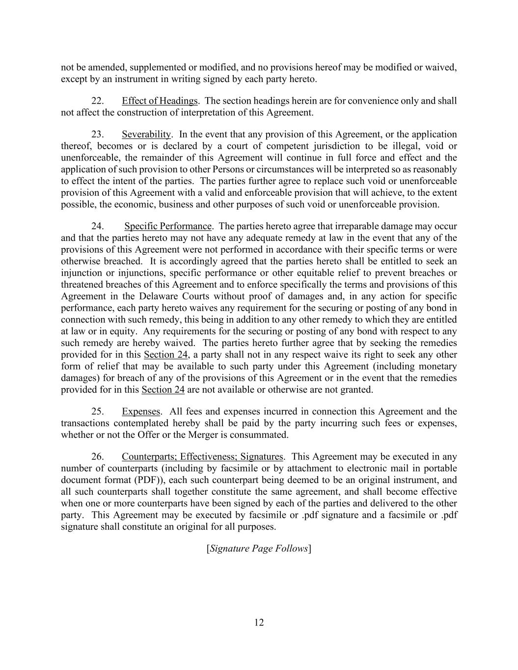 12 not be amended, supplemented or modified, and no provisions hereof may be modified or waived, except by an instrument in writing signed by each party hereto. 22. Effect of Headings. The section headings herein are for convenience only and shall not affect the construction of interpretation of this Agreement. 23. Severability. In the event that any provision of this Agreement, or the application thereof, becomes or is declared by a court of competent jurisdiction to be illegal, void or unenforceable, the remainder of this Agreement will continue in full force and effect and the application of such provision to other Persons or circumstances will be interpreted so as reasonably to effect the intent of the parties. The parties further agree to replace such void or unenforceable provision of this Agreement with a valid and enforceable provision that will achieve, to the extent possible, the economic, business and other purposes of such void or unenforceable provision. 24. Specific Performance. The parties hereto agree that irreparable damage may occur and that the parties hereto may not have any adequate remedy at law in the event that any of the provisions of this Agreement were not performed in accordance with their specific terms or were otherwise breached. It is accordingly agreed that the parties hereto shall be entitled to seek an injunction or injunctions, specific performance or other equitable relief to prevent breaches or threatened breaches of this Agreement and to enforce specifically the terms and provisions of this Agreement in the Delaware Courts without proof of damages and, in any action for specific performance, each party hereto waives any requirement for the securing or posting of any bond in connection with such remedy, this being in addition to any other remedy to which they are entitled at law or in equity. Any requirements for the securing or posting of any bond with respect to any such remedy are hereby waived. The parties hereto further agree that by seeking the remedies provided for in this Section 24, a party shall not in any respect waive its right to seek any other form of relief that may be available to such party under this Agreement (including monetary damages) for breach of any of the provisions of this Agreement or in the event that the remedies provided for in this Section 24 are not available or otherwise are not granted. 25. Expenses. All fees and expenses incurred in connection this Agreement and the transactions contemplated hereby shall be paid by the party incurring such fees or expenses, whether or not the Offer or the Merger is consummated. 26. Counterparts; Effectiveness; Signatures. This Agreement may be executed in any number of counterparts (including by facsimile or by attachment to electronic mail in portable document format (PDF)), each such counterpart being deemed to be an original instrument, and all such counterparts shall together constitute the same agreement, and shall become effective when one or more counterparts have been signed by each of the parties and delivered to the other party. This Agreement may be executed by facsimile or .pdf signature and a facsimile or .pdf signature shall constitute an original for all purposes. [Signature Page Follows]