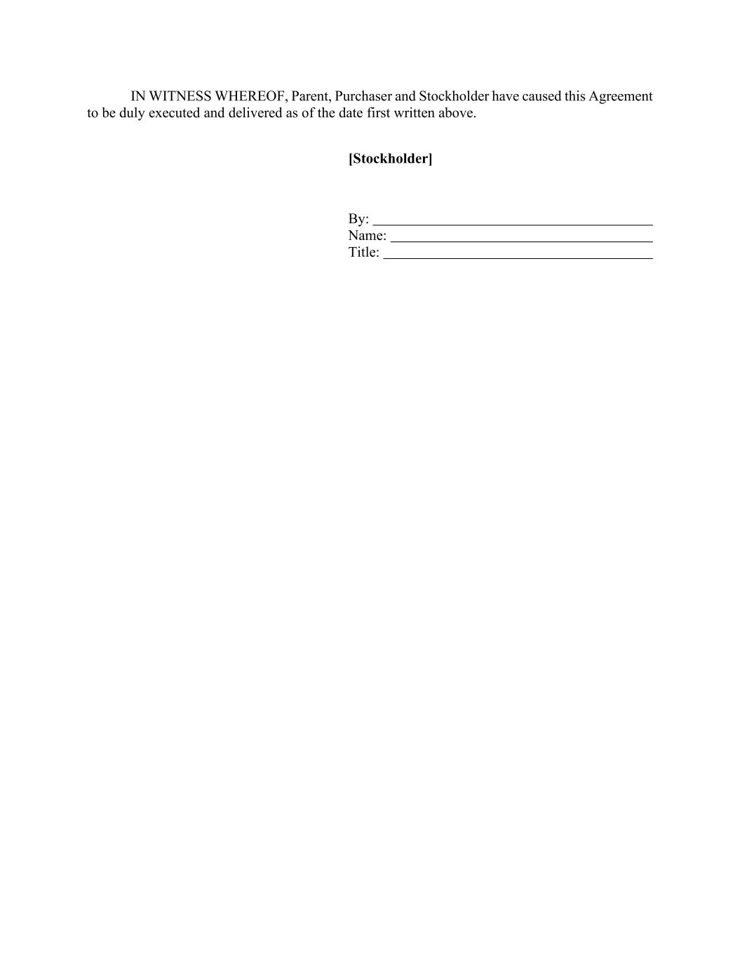 IN WITNESS WHEREOF, Parent, Purchaser and Stockholder have caused this Agreement to be duly executed and delivered as of the date first written above. [Stockholder] By: Name: Title: