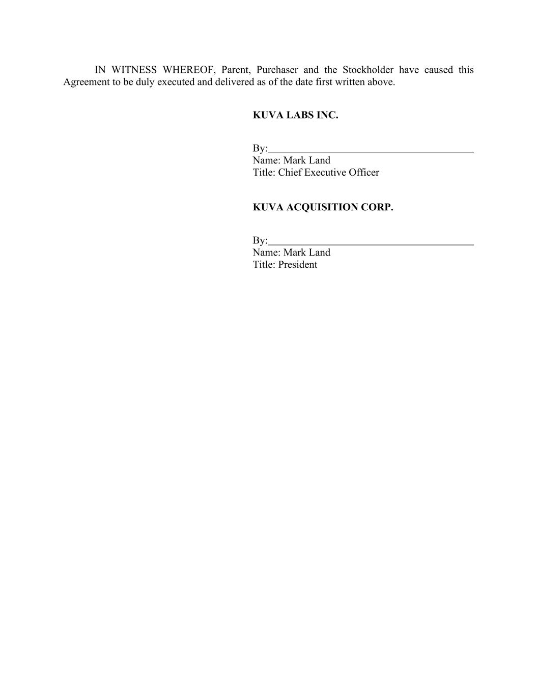 IN WITNESS WHEREOF, Parent, Purchaser and the Stockholder have caused this Agreement to be duly executed and delivered as of the date first written above. KUVA LABS INC. By: Name: Mark Land Title: Chief Executive Officer KUVA ACQUISITION CORP. By: Name: Mark Land Title: President