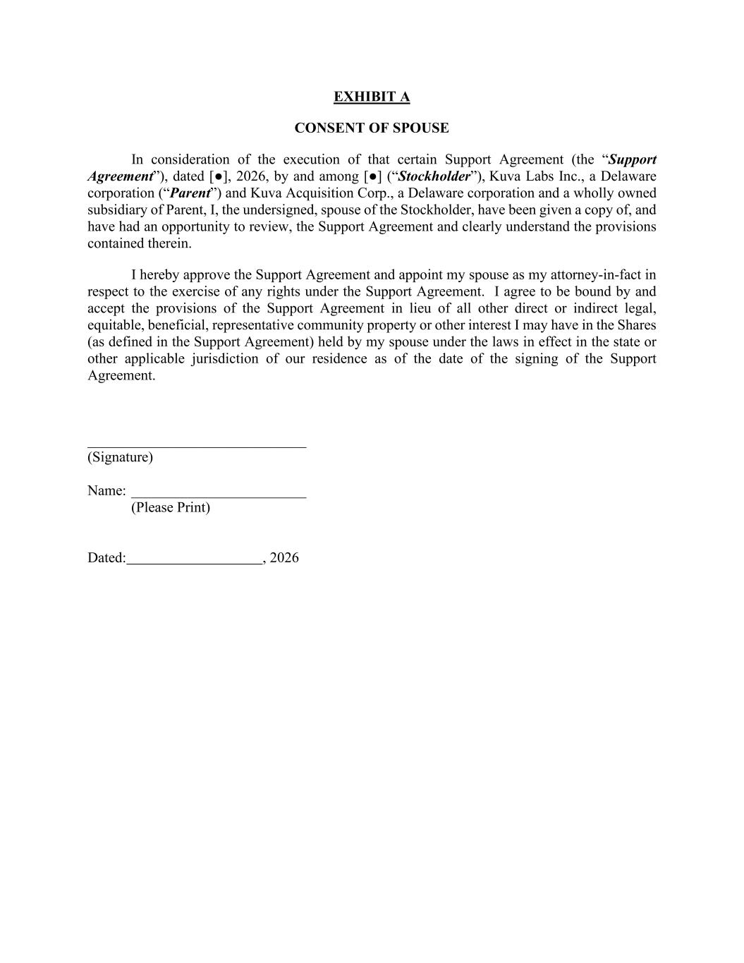 EXHIBIT A CONSENT OF SPOUSE In consideration of the execution of that certain Support Agreement (the “Support Agreement”), dated [●], 2026, by and among [●] (“Stockholder”), Kuva Labs Inc., a Delaware corporation (“Parent”) and Kuva Acquisition Corp., a Delaware corporation and a wholly owned subsidiary of Parent, I, the undersigned, spouse of the Stockholder, have been given a copy of, and have had an opportunity to review, the Support Agreement and clearly understand the provisions contained therein. I hereby approve the Support Agreement and appoint my spouse as my attorney-in-fact in respect to the exercise of any rights under the Support Agreement. I agree to be bound by and accept the provisions of the Support Agreement in lieu of all other direct or indirect legal, equitable, beneficial, representative community property or other interest I may have in the Shares (as defined in the Support Agreement) held by my spouse under the laws in effect in the state or other applicable jurisdiction of our residence as of the date of the signing of the Support Agreement. ______________________________ (Signature) Name: ________________________ (Please Print) Dated: , 2026