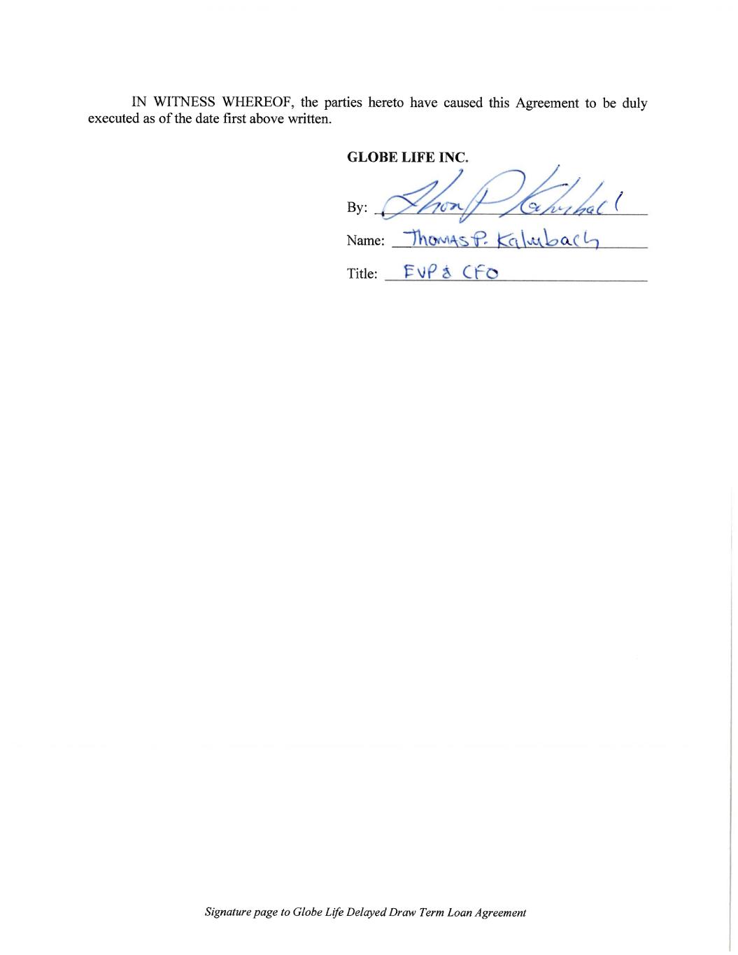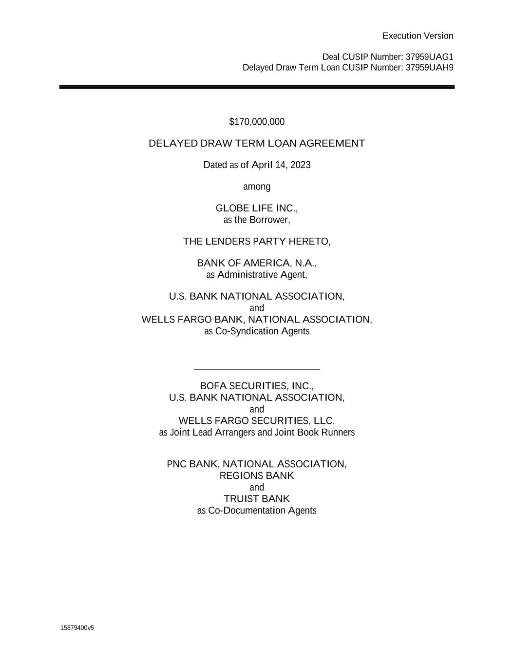 15879400v5 Execution Version Deal CUSIP Number: 37959UAG1 Delayed Draw Term Loan CUSIP Number: 37959UAH9 $170,000,000 DELAYED DRAW TERM LOAN AGREEMENT Dated as of April 14, 2023 among GLOBE LIFE INC., as the Borrower, THE LENDERS PARTY HERETO, BANK OF AMERICA, N.A., as Administrative Agent, U.S. BANK NATIONAL ASSOCIATION, and WELLS FARGO BANK, NATIONAL ASSOCIATION, as Co-Syndication Agents _________________________ BOFA SECURITIES, INC., U.S. BANK NATIONAL ASSOCIATION, and WELLS FARGO SECURITIES, LLC, as Joint Lead Arrangers and Joint Book Runners PNC BANK, NATIONAL ASSOCIATION, REGIONS BANK and TRUIST BANK as Co-Documentation Agents