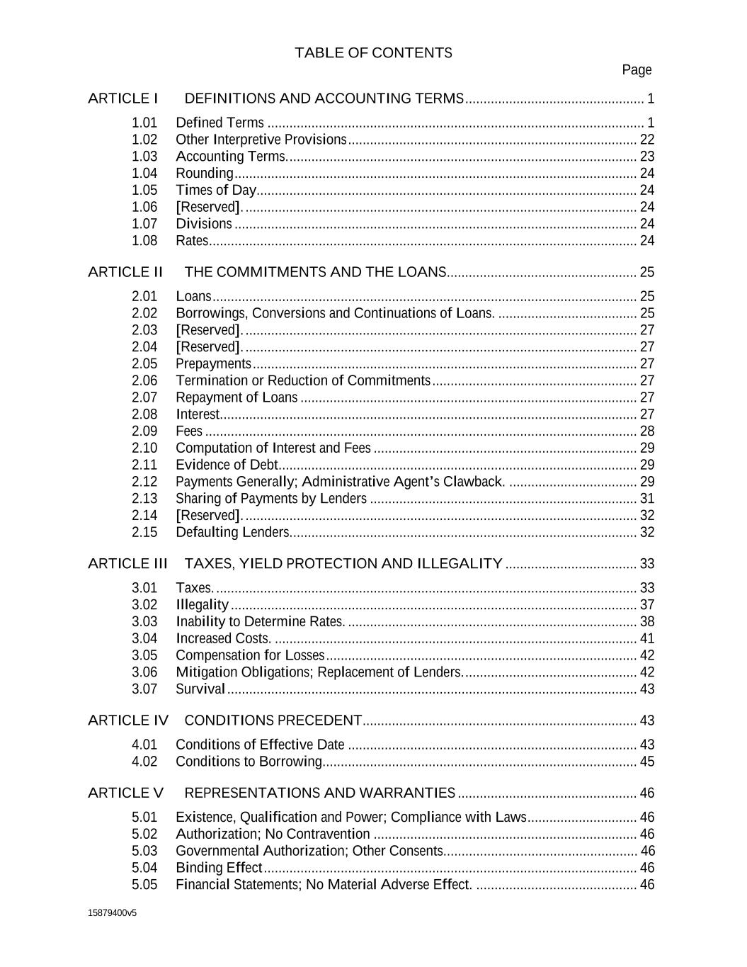 15879400v5 TABLE OF CONTENTS Page ARTICLE I DEFINITIONS AND ACCOUNTING TERMS ................................................. 1 1.01 Defined Terms ....................................................................................................... 1 1.02 Other Interpretive Provisions ............................................................................... 22 1.03 Accounting Terms. ............................................................................................... 23 1.04 Rounding .............................................................................................................. 24 1.05 Times of Day........................................................................................................ 24 1.06 [Reserved]. ........................................................................................................... 24 1.07 Divisions .............................................................................................................. 24 1.08 Rates ..................................................................................................................... 24 ARTICLE II THE COMMITMENTS AND THE LOANS .................................................... 25 2.01 Loans .................................................................................................................... 25 2.02 Borrowings, Conversions and Continuations of Loans. ...................................... 25 2.03 [Reserved]. ........................................................................................................... 27 2.04 [Reserved]. ........................................................................................................... 27 2.05 Prepayments ......................................................................................................... 27 2.06 Termination or Reduction of Commitments ........................................................ 27 2.07 Repayment of Loans ............................................................................................ 27 2.08 Interest.................................................................................................................. 27 2.09 Fees ...................................................................................................................... 28 2.10 Computation of Interest and Fees ........................................................................ 29 2.11 Evidence of Debt.................................................................................................. 29 2.12 Payments Generally; Administrative Agent’s Clawback. ................................... 29 2.13 Sharing of Payments by Lenders ......................................................................... 31 2.14 [Reserved]. ........................................................................................................... 32 2.15 Defaulting Lenders............................................................................................... 32 ARTICLE III TAXES, YIELD PROTECTION AND ILLEGALITY .................................... 33 3.01 Taxes. ................................................................................................................... 33 3.02 Illegality ............................................................................................................... 37 3.03 Inability to Determine Rates. ............................................................................... 38 3.04 Increased Costs. ................................................................................................... 41 3.05 Compensation for Losses ..................................................................................... 42 3.06 Mitigation Obligations; Replacement of Lenders. ............................................... 42 3.07 Survival ................................................................................................................ 43 ARTICLE IV CONDITIONS PRECEDENT ........................................................................... 43 4.01 Conditions of Effective Date ............................................................................... 43 4.02 Conditions to Borrowing...................................................................................... 45 ARTICLE V REPRESENTATIONS AND WARRANTIES ................................................. 46 5.01 Existence, Qualification and Power; Compliance with Laws .............................. 46 5.02 Authorization; No Contravention ........................................................................ 46 5.03 Governmental Authorization; Other Consents..................................................... 46 5.04 Binding Effect ...................................................................................................... 46 5.05 Financial Statements; No Material Adverse Effect. ............................................ 46