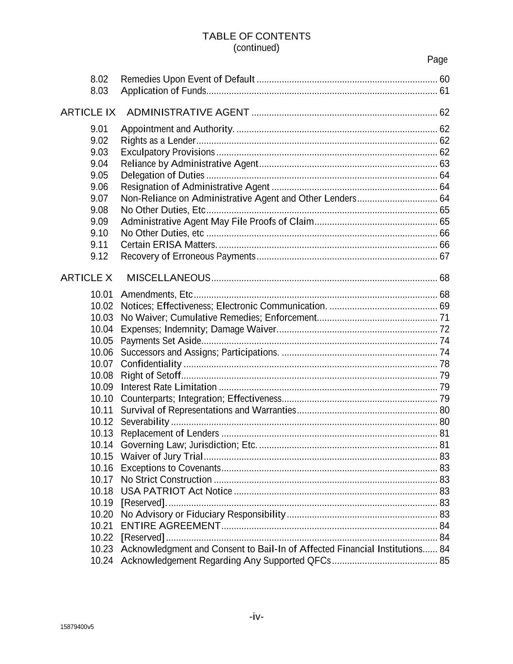 15879400v5 TABLE OF CONTENTS (continued) Page -iv- 8.02 Remedies Upon Event of Default ........................................................................ 60 8.03 Application of Funds............................................................................................ 61 ARTICLE IX ADMINISTRATIVE AGENT .......................................................................... 62 9.01 Appointment and Authority. ................................................................................ 62 9.02 Rights as a Lender ................................................................................................ 62 9.03 Exculpatory Provisions ........................................................................................ 62 9.04 Reliance by Administrative Agent ....................................................................... 63 9.05 Delegation of Duties ............................................................................................ 64 9.06 Resignation of Administrative Agent .................................................................. 64 9.07 Non-Reliance on Administrative Agent and Other Lenders ................................ 64 9.08 No Other Duties, Etc ............................................................................................ 65 9.09 Administrative Agent May File Proofs of Claim ................................................. 65 9.10 No Other Duties, etc ............................................................................................ 66 9.11 Certain ERISA Matters. ....................................................................................... 66 9.12 Recovery of Erroneous Payments ........................................................................ 67 ARTICLE X MISCELLANEOUS .......................................................................................... 68 10.01 Amendments, Etc ................................................................................................. 68 10.02 Notices; Effectiveness; Electronic Communication. ........................................... 69 10.03 No Waiver; Cumulative Remedies; Enforcement................................................ 71 10.04 Expenses; Indemnity; Damage Waiver. ............................................................... 72 10.05 Payments Set Aside.............................................................................................. 74 10.06 Successors and Assigns; Participations. .............................................................. 74 10.07 Confidentiality ..................................................................................................... 78 10.08 Right of Setoff...................................................................................................... 79 10.09 Interest Rate Limitation ....................................................................................... 79 10.10 Counterparts; Integration; Effectiveness .............................................................. 79 10.11 Survival of Representations and Warranties ........................................................ 80 10.12 Severability .......................................................................................................... 80 10.13 Replacement of Lenders ...................................................................................... 81 10.14 Governing Law; Jurisdiction; Etc. ....................................................................... 81 10.15 Waiver of Jury Trial ............................................................................................. 83 10.16 Exceptions to Covenants ...................................................................................... 83 10.17 No Strict Construction ......................................................................................... 83 10.18 USA PATRIOT Act Notice ................................................................................. 83 10.19 [Reserved]. ........................................................................................................... 83 10.20 No Advisory or Fiduciary Responsibility ............................................................ 83 10.21 ENTIRE AGREEMENT ...................................................................................... 84 10.22 [Reserved] ............................................................................................................ 84 10.23 Acknowledgment and Consent to Bail-In of Affected Financial Institutions...... 84 10.24 Acknowledgement Regarding Any Supported QFCs .......................................... 85