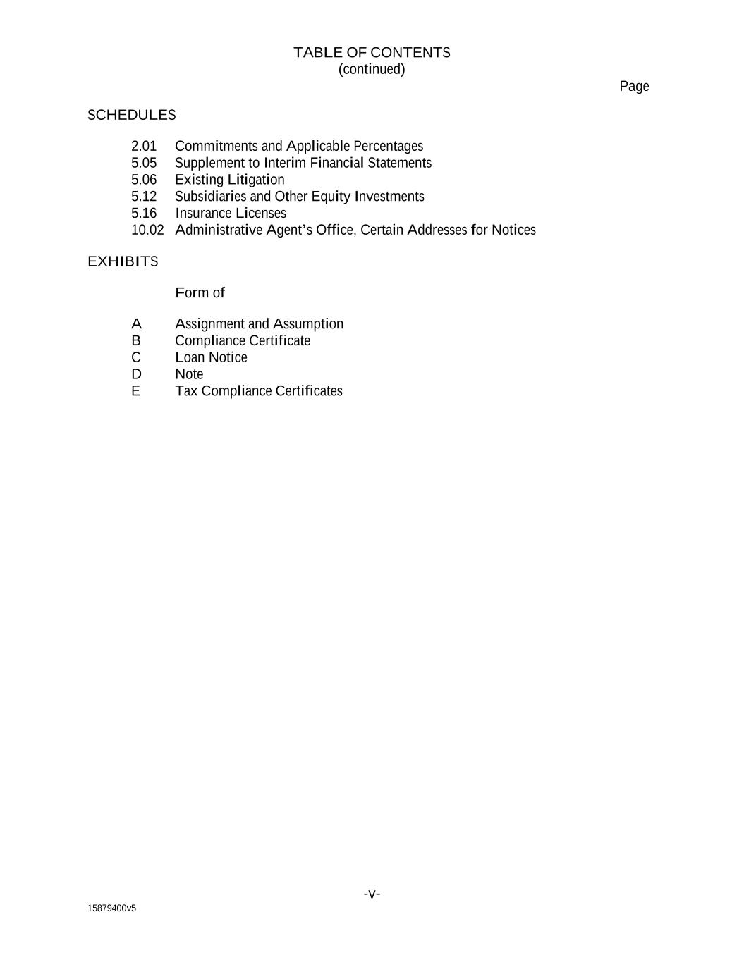 15879400v5 TABLE OF CONTENTS (continued) Page -v- SCHEDULES 2.01 Commitments and Applicable Percentages 5.05 Supplement to Interim Financial Statements 5.06 Existing Litigation 5.12 Subsidiaries and Other Equity Investments 5.16 Insurance Licenses 10.02 Administrative Agent’s Office, Certain Addresses for Notices EXHIBITS Form of A Assignment and Assumption B Compliance Certificate C Loan Notice D Note E Tax Compliance Certificates