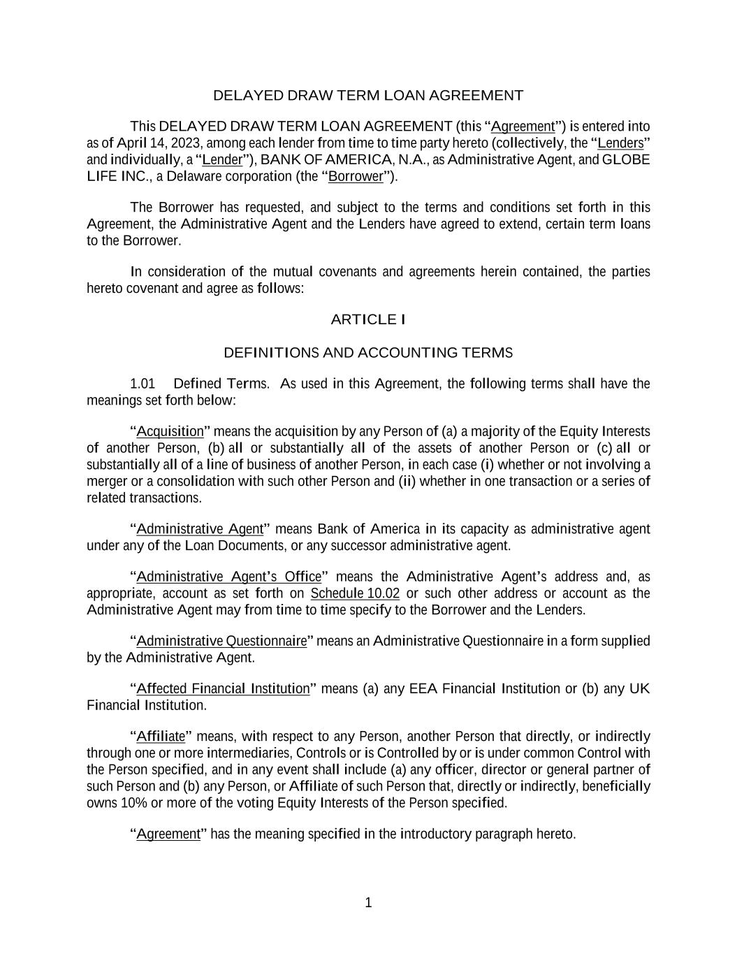 1 DELAYED DRAW TERM LOAN AGREEMENT This DELAYED DRAW TERM LOAN AGREEMENT (this “Agreement”) is entered into as of April 14, 2023, among each lender from time to time party hereto (collectively, the “Lenders” and individually, a “Lender”), BANK OF AMERICA, N.A., as Administrative Agent, and GLOBE LIFE INC., a Delaware corporation (the “Borrower”). The Borrower has requested, and subject to the terms and conditions set forth in this Agreement, the Administrative Agent and the Lenders have agreed to extend, certain term loans to the Borrower. In consideration of the mutual covenants and agreements herein contained, the parties hereto covenant and agree as follows: ARTICLE I DEFINITIONS AND ACCOUNTING TERMS 1.01 Defined Terms. As used in this Agreement, the following terms shall have the meanings set forth below: “Acquisition” means the acquisition by any Person of (a) a majority of the Equity Interests of another Person, (b) all or substantially all of the assets of another Person or (c) all or substantially all of a line of business of another Person, in each case (i) whether or not involving a merger or a consolidation with such other Person and (ii) whether in one transaction or a series of related transactions. “Administrative Agent” means Bank of America in its capacity as administrative agent under any of the Loan Documents, or any successor administrative agent. “Administrative Agent’s Office” means the Administrative Agent’s address and, as appropriate, account as set forth on Schedule 10.02 or such other address or account as the Administrative Agent may from time to time specify to the Borrower and the Lenders. “Administrative Questionnaire” means an Administrative Questionnaire in a form supplied by the Administrative Agent. “Affected Financial Institution” means (a) any EEA Financial Institution or (b) any UK Financial Institution. “Affiliate” means, with respect to any Person, another Person that directly, or indirectly through one or more intermediaries, Controls or is Controlled by or is under common Control with the Person specified, and in any event shall include (a) any officer, director or general partner of such Person and (b) any Person, or Affiliate of such Person that, directly or indirectly, beneficially owns 10% or more of the voting Equity Interests of the Person specified. “Agreement” has the meaning specified in the introductory paragraph hereto.
