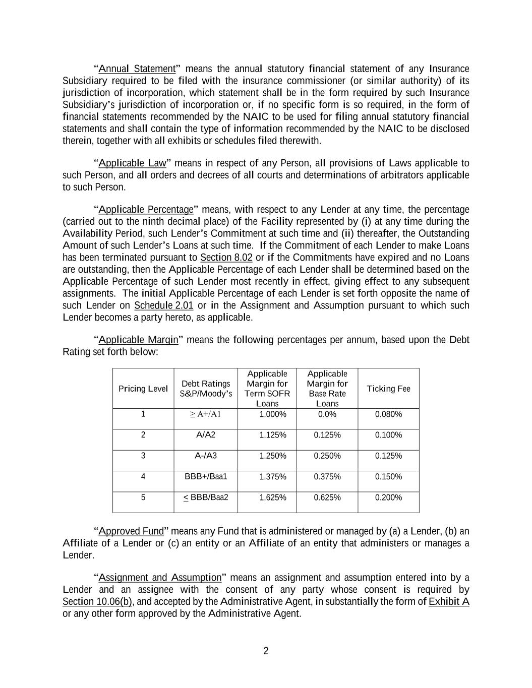 2 “Annual Statement” means the annual statutory financial statement of any Insurance Subsidiary required to be filed with the insurance commissioner (or similar authority) of its jurisdiction of incorporation, which statement shall be in the form required by such Insurance Subsidiary’s jurisdiction of incorporation or, if no specific form is so required, in the form of financial statements recommended by the NAIC to be used for filing annual statutory financial statements and shall contain the type of information recommended by the NAIC to be disclosed therein, together with all exhibits or schedules filed therewith. “Applicable Law” means in respect of any Person, all provisions of Laws applicable to such Person, and all orders and decrees of all courts and determinations of arbitrators applicable to such Person. “Applicable Percentage” means, with respect to any Lender at any time, the percentage (carried out to the ninth decimal place) of the Facility represented by (i) at any time during the Availability Period, such Lender’s Commitment at such time and (ii) thereafter, the Outstanding Amount of such Lender’s Loans at such time. If the Commitment of each Lender to make Loans has been terminated pursuant to Section 8.02 or if the Commitments have expired and no Loans are outstanding, then the Applicable Percentage of each Lender shall be determined based on the Applicable Percentage of such Lender most recently in effect, giving effect to any subsequent assignments. The initial Applicable Percentage of each Lender is set forth opposite the name of such Lender on Schedule 2.01 or in the Assignment and Assumption pursuant to which such Lender becomes a party hereto, as applicable. “Applicable Margin” means the following percentages per annum, based upon the Debt Rating set forth below: Pricing Level Debt Ratings S&P/Moody’s Applicable Margin for Term SOFR Loans Applicable Margin for Base Rate Loans Ticking Fee 1 ≥ A+/A1 1.000% 0.0% 0.080% 2 A/A2 1.125% 0.125% 0.100% 3 A-/A3 1.250% 0.250% 0.125% 4 BBB+/Baa1 1.375% 0.375% 0.150% 5 < BBB/Baa2 1.625% 0.625% 0.200% “Approved Fund” means any Fund that is administered or managed by (a) a Lender, (b) an Affiliate of a Lender or (c) an entity or an Affiliate of an entity that administers or manages a Lender. “Assignment and Assumption” means an assignment and assumption entered into by a Lender and an assignee with the consent of any party whose consent is required by Section 10.06(b), and accepted by the Administrative Agent, in substantially the form of Exhibit A or any other form approved by the Administrative Agent.