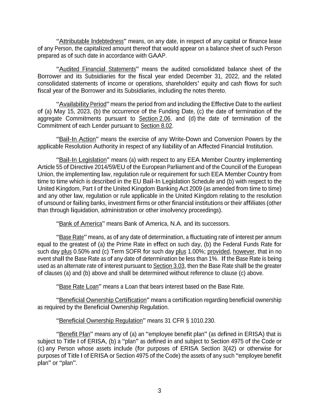 3 “Attributable Indebtedness” means, on any date, in respect of any capital or finance lease of any Person, the capitalized amount thereof that would appear on a balance sheet of such Person prepared as of such date in accordance with GAAP. “Audited Financial Statements” means the audited consolidated balance sheet of the Borrower and its Subsidiaries for the fiscal year ended December 31, 2022, and the related consolidated statements of income or operations, shareholders’ equity and cash flows for such fiscal year of the Borrower and its Subsidiaries, including the notes thereto. “Availability Period” means the period from and including the Effective Date to the earliest of (a) May 15, 2023, (b) the occurrence of the Funding Date, (c) the date of termination of the aggregate Commitments pursuant to Section 2.06, and (d) the date of termination of the Commitment of each Lender pursuant to Section 8.02. “Bail-In Action” means the exercise of any Write-Down and Conversion Powers by the applicable Resolution Authority in respect of any liability of an Affected Financial Institution. “Bail-In Legislation” means (a) with respect to any EEA Member Country implementing Article 55 of Directive 2014/59/EU of the European Parliament and of the Council of the European Union, the implementing law, regulation rule or requirement for such EEA Member Country from time to time which is described in the EU Bail-In Legislation Schedule and (b) with respect to the United Kingdom, Part I of the United Kingdom Banking Act 2009 (as amended from time to time) and any other law, regulation or rule applicable in the United Kingdom relating to the resolution of unsound or failing banks, investment firms or other financial institutions or their affiliates (other than through liquidation, administration or other insolvency proceedings). “Bank of America” means Bank of America, N.A. and its successors. “Base Rate” means, as of any date of determination, a fluctuating rate of interest per annum equal to the greatest of (a) the Prime Rate in effect on such day, (b) the Federal Funds Rate for such day plus 0.50% and (c) Term SOFR for such day plus 1.00%; provided, however, that in no event shall the Base Rate as of any date of determination be less than 1%. If the Base Rate is being used as an alternate rate of interest pursuant to Section 3.03, then the Base Rate shall be the greater of clauses (a) and (b) above and shall be determined without reference to clause (c) above. “Base Rate Loan” means a Loan that bears interest based on the Base Rate. “Beneficial Ownership Certification” means a certification regarding beneficial ownership as required by the Beneficial Ownership Regulation. “Beneficial Ownership Regulation” means 31 CFR § 1010.230. “Benefit Plan” means any of (a) an “employee benefit plan” (as defined in ERISA) that is subject to Title I of ERISA, (b) a “plan” as defined in and subject to Section 4975 of the Code or (c) any Person whose assets include (for purposes of ERISA Section 3(42) or otherwise for purposes of Title I of ERISA or Section 4975 of the Code) the assets of any such “employee benefit plan” or “plan”.