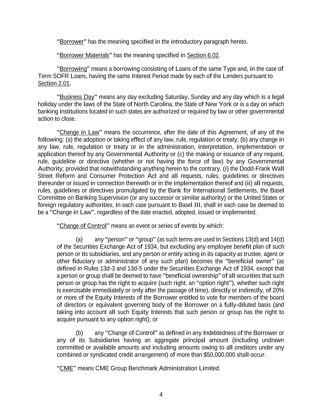 4 “Borrower” has the meaning specified in the introductory paragraph hereto. “Borrower Materials” has the meaning specified in Section 6.02. “Borrowing” means a borrowing consisting of Loans of the same Type and, in the case of Term SOFR Loans, having the same Interest Period made by each of the Lenders pursuant to Section 2.01. “Business Day” means any day excluding Saturday, Sunday and any day which is a legal holiday under the laws of the State of North Carolina, the State of New York or is a day on which banking institutions located in such states are authorized or required by law or other governmental action to close. “Change in Law” means the occurrence, after the date of this Agreement, of any of the following: (a) the adoption or taking effect of any law, rule, regulation or treaty, (b) any change in any law, rule, regulation or treaty or in the administration, interpretation, implementation or application thereof by any Governmental Authority or (c) the making or issuance of any request, rule, guideline or directive (whether or not having the force of law) by any Governmental Authority; provided that notwithstanding anything herein to the contrary, (i) the Dodd-Frank Wall Street Reform and Consumer Protection Act and all requests, rules, guidelines or directives thereunder or issued in connection therewith or in the implementation thereof and (ii) all requests, rules, guidelines or directives promulgated by the Bank for International Settlements, the Basel Committee on Banking Supervision (or any successor or similar authority) or the United States or foreign regulatory authorities, in each case pursuant to Basel III, shall in each case be deemed to be a “Change in Law”, regardless of the date enacted, adopted, issued or implemented. “Change of Control” means an event or series of events by which: (a) any “person” or “group” (as such terms are used in Sections 13(d) and 14(d) of the Securities Exchange Act of 1934, but excluding any employee benefit plan of such person or its subsidiaries, and any person or entity acting in its capacity as trustee, agent or other fiduciary or administrator of any such plan) becomes the “beneficial owner” (as defined in Rules 13d-3 and 13d-5 under the Securities Exchange Act of 1934, except that a person or group shall be deemed to have “beneficial ownership” of all securities that such person or group has the right to acquire (such right, an “option right”), whether such right is exercisable immediately or only after the passage of time), directly or indirectly, of 20% or more of the Equity Interests of the Borrower entitled to vote for members of the board of directors or equivalent governing body of the Borrower on a fully-diluted basis (and taking into account all such Equity Interests that such person or group has the right to acquire pursuant to any option right); or (b) any “Change of Control” as defined in any Indebtedness of the Borrower or any of its Subsidiaries having an aggregate principal amount (including undrawn committed or available amounts and including amounts owing to all creditors under any combined or syndicated credit arrangement) of more than $50,000,000 shall occur. “CME” means CME Group Benchmark Administration Limited.