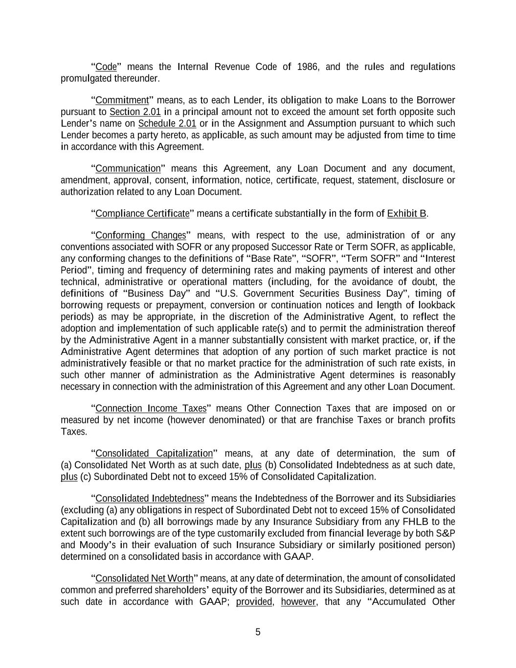 5 “Code” means the Internal Revenue Code of 1986, and the rules and regulations promulgated thereunder. “Commitment” means, as to each Lender, its obligation to make Loans to the Borrower pursuant to Section 2.01 in a principal amount not to exceed the amount set forth opposite such Lender’s name on Schedule 2.01 or in the Assignment and Assumption pursuant to which such Lender becomes a party hereto, as applicable, as such amount may be adjusted from time to time in accordance with this Agreement. “Communication” means this Agreement, any Loan Document and any document, amendment, approval, consent, information, notice, certificate, request, statement, disclosure or authorization related to any Loan Document. “Compliance Certificate” means a certificate substantially in the form of Exhibit B. “Conforming Changes” means, with respect to the use, administration of or any conventions associated with SOFR or any proposed Successor Rate or Term SOFR, as applicable, any conforming changes to the definitions of “Base Rate”, “SOFR”, “Term SOFR” and “Interest Period”, timing and frequency of determining rates and making payments of interest and other technical, administrative or operational matters (including, for the avoidance of doubt, the definitions of “Business Day” and “U.S. Government Securities Business Day”, timing of borrowing requests or prepayment, conversion or continuation notices and length of lookback periods) as may be appropriate, in the discretion of the Administrative Agent, to reflect the adoption and implementation of such applicable rate(s) and to permit the administration thereof by the Administrative Agent in a manner substantially consistent with market practice, or, if the Administrative Agent determines that adoption of any portion of such market practice is not administratively feasible or that no market practice for the administration of such rate exists, in such other manner of administration as the Administrative Agent determines is reasonably necessary in connection with the administration of this Agreement and any other Loan Document. “Connection Income Taxes” means Other Connection Taxes that are imposed on or measured by net income (however denominated) or that are franchise Taxes or branch profits Taxes. “Consolidated Capitalization” means, at any date of determination, the sum of (a) Consolidated Net Worth as at such date, plus (b) Consolidated Indebtedness as at such date, plus (c) Subordinated Debt not to exceed 15% of Consolidated Capitalization. “Consolidated Indebtedness” means the Indebtedness of the Borrower and its Subsidiaries (excluding (a) any obligations in respect of Subordinated Debt not to exceed 15% of Consolidated Capitalization and (b) all borrowings made by any Insurance Subsidiary from any FHLB to the extent such borrowings are of the type customarily excluded from financial leverage by both S&P and Moody’s in their evaluation of such Insurance Subsidiary or similarly positioned person) determined on a consolidated basis in accordance with GAAP. “Consolidated Net Worth” means, at any date of determination, the amount of consolidated common and preferred shareholders’ equity of the Borrower and its Subsidiaries, determined as at such date in accordance with GAAP; provided, however, that any “Accumulated Other