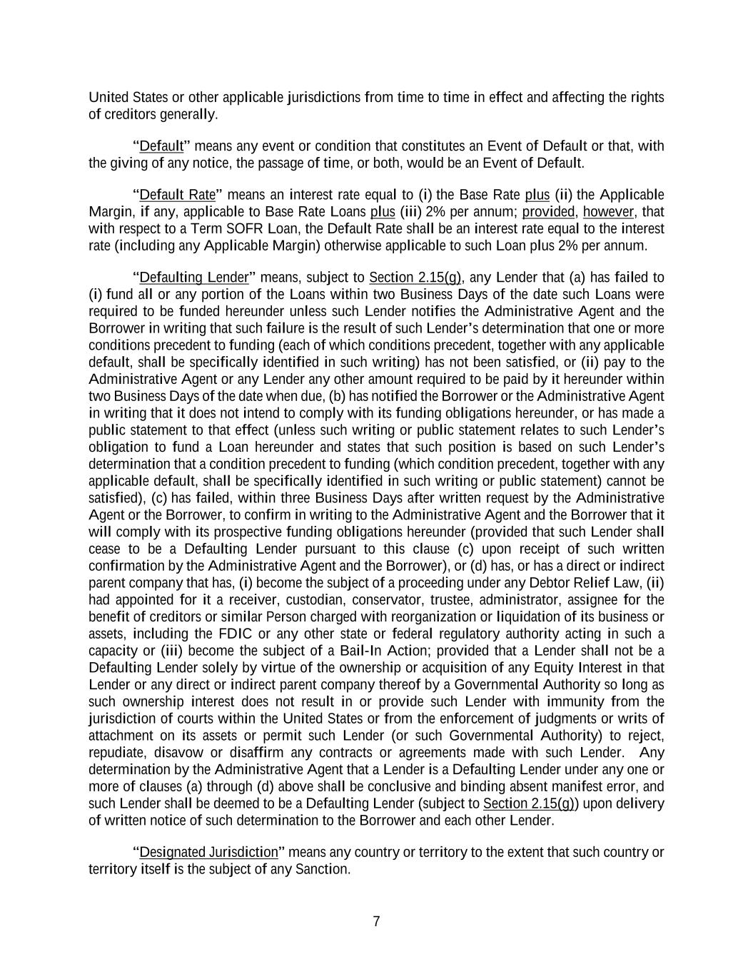7 United States or other applicable jurisdictions from time to time in effect and affecting the rights of creditors generally. “Default” means any event or condition that constitutes an Event of Default or that, with the giving of any notice, the passage of time, or both, would be an Event of Default. “Default Rate” means an interest rate equal to (i) the Base Rate plus (ii) the Applicable Margin, if any, applicable to Base Rate Loans plus (iii) 2% per annum; provided, however, that with respect to a Term SOFR Loan, the Default Rate shall be an interest rate equal to the interest rate (including any Applicable Margin) otherwise applicable to such Loan plus 2% per annum. “Defaulting Lender” means, subject to Section 2.15(g), any Lender that (a) has failed to (i) fund all or any portion of the Loans within two Business Days of the date such Loans were required to be funded hereunder unless such Lender notifies the Administrative Agent and the Borrower in writing that such failure is the result of such Lender’s determination that one or more conditions precedent to funding (each of which conditions precedent, together with any applicable default, shall be specifically identified in such writing) has not been satisfied, or (ii) pay to the Administrative Agent or any Lender any other amount required to be paid by it hereunder within two Business Days of the date when due, (b) has notified the Borrower or the Administrative Agent in writing that it does not intend to comply with its funding obligations hereunder, or has made a public statement to that effect (unless such writing or public statement relates to such Lender’s obligation to fund a Loan hereunder and states that such position is based on such Lender’s determination that a condition precedent to funding (which condition precedent, together with any applicable default, shall be specifically identified in such writing or public statement) cannot be satisfied), (c) has failed, within three Business Days after written request by the Administrative Agent or the Borrower, to confirm in writing to the Administrative Agent and the Borrower that it will comply with its prospective funding obligations hereunder (provided that such Lender shall cease to be a Defaulting Lender pursuant to this clause (c) upon receipt of such written confirmation by the Administrative Agent and the Borrower), or (d) has, or has a direct or indirect parent company that has, (i) become the subject of a proceeding under any Debtor Relief Law, (ii) had appointed for it a receiver, custodian, conservator, trustee, administrator, assignee for the benefit of creditors or similar Person charged with reorganization or liquidation of its business or assets, including the FDIC or any other state or federal regulatory authority acting in such a capacity or (iii) become the subject of a Bail-In Action; provided that a Lender shall not be a Defaulting Lender solely by virtue of the ownership or acquisition of any Equity Interest in that Lender or any direct or indirect parent company thereof by a Governmental Authority so long as such ownership interest does not result in or provide such Lender with immunity from the jurisdiction of courts within the United States or from the enforcement of judgments or writs of attachment on its assets or permit such Lender (or such Governmental Authority) to reject, repudiate, disavow or disaffirm any contracts or agreements made with such Lender. Any determination by the Administrative Agent that a Lender is a Defaulting Lender under any one or more of clauses (a) through (d) above shall be conclusive and binding absent manifest error, and such Lender shall be deemed to be a Defaulting Lender (subject to Section 2.15(g)) upon delivery of written notice of such determination to the Borrower and each other Lender. “Designated Jurisdiction” means any country or territory to the extent that such country or territory itself is the subject of any Sanction.