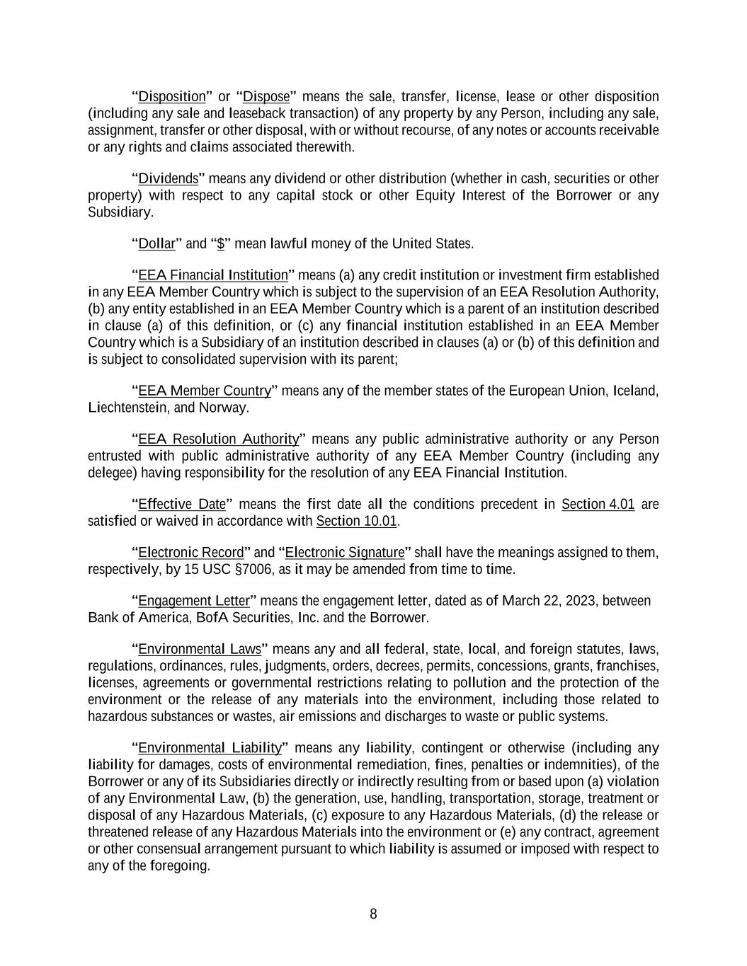 8 “Disposition” or “Dispose” means the sale, transfer, license, lease or other disposition (including any sale and leaseback transaction) of any property by any Person, including any sale, assignment, transfer or other disposal, with or without recourse, of any notes or accounts receivable or any rights and claims associated therewith. “Dividends” means any dividend or other distribution (whether in cash, securities or other property) with respect to any capital stock or other Equity Interest of the Borrower or any Subsidiary. “Dollar” and “$” mean lawful money of the United States. “EEA Financial Institution” means (a) any credit institution or investment firm established in any EEA Member Country which is subject to the supervision of an EEA Resolution Authority, (b) any entity established in an EEA Member Country which is a parent of an institution described in clause (a) of this definition, or (c) any financial institution established in an EEA Member Country which is a Subsidiary of an institution described in clauses (a) or (b) of this definition and is subject to consolidated supervision with its parent; “EEA Member Country” means any of the member states of the European Union, Iceland, Liechtenstein, and Norway. “EEA Resolution Authority” means any public administrative authority or any Person entrusted with public administrative authority of any EEA Member Country (including any delegee) having responsibility for the resolution of any EEA Financial Institution. “Effective Date” means the first date all the conditions precedent in Section 4.01 are satisfied or waived in accordance with Section 10.01. “Electronic Record” and “Electronic Signature” shall have the meanings assigned to them, respectively, by 15 USC §7006, as it may be amended from time to time. “Engagement Letter” means the engagement letter, dated as of March 22, 2023, between Bank of America, BofA Securities, Inc. and the Borrower. “Environmental Laws” means any and all federal, state, local, and foreign statutes, laws, regulations, ordinances, rules, judgments, orders, decrees, permits, concessions, grants, franchises, licenses, agreements or governmental restrictions relating to pollution and the protection of the environment or the release of any materials into the environment, including those related to hazardous substances or wastes, air emissions and discharges to waste or public systems. “Environmental Liability” means any liability, contingent or otherwise (including any liability for damages, costs of environmental remediation, fines, penalties or indemnities), of the Borrower or any of its Subsidiaries directly or indirectly resulting from or based upon (a) violation of any Environmental Law, (b) the generation, use, handling, transportation, storage, treatment or disposal of any Hazardous Materials, (c) exposure to any Hazardous Materials, (d) the release or threatened release of any Hazardous Materials into the environment or (e) any contract, agreement or other consensual arrangement pursuant to which liability is assumed or imposed with respect to any of the foregoing.