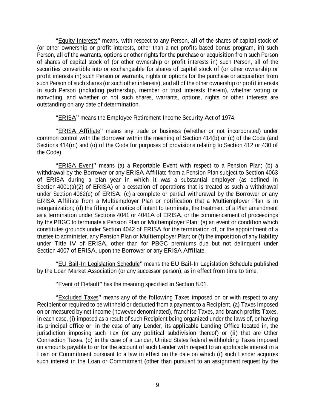 9 “Equity Interests” means, with respect to any Person, all of the shares of capital stock of (or other ownership or profit interests, other than a net profits based bonus program, in) such Person, all of the warrants, options or other rights for the purchase or acquisition from such Person of shares of capital stock of (or other ownership or profit interests in) such Person, all of the securities convertible into or exchangeable for shares of capital stock of (or other ownership or profit interests in) such Person or warrants, rights or options for the purchase or acquisition from such Person of such shares (or such other interests), and all of the other ownership or profit interests in such Person (including partnership, member or trust interests therein), whether voting or nonvoting, and whether or not such shares, warrants, options, rights or other interests are outstanding on any date of determination. “ERISA” means the Employee Retirement Income Security Act of 1974. “ERISA Affiliate” means any trade or business (whether or not incorporated) under common control with the Borrower within the meaning of Section 414(b) or (c) of the Code (and Sections 414(m) and (o) of the Code for purposes of provisions relating to Section 412 or 430 of the Code). “ERISA Event” means (a) a Reportable Event with respect to a Pension Plan; (b) a withdrawal by the Borrower or any ERISA Affiliate from a Pension Plan subject to Section 4063 of ERISA during a plan year in which it was a substantial employer (as defined in Section 4001(a)(2) of ERISA) or a cessation of operations that is treated as such a withdrawal under Section 4062(e) of ERISA; (c) a complete or partial withdrawal by the Borrower or any ERISA Affiliate from a Multiemployer Plan or notification that a Multiemployer Plan is in reorganization; (d) the filing of a notice of intent to terminate, the treatment of a Plan amendment as a termination under Sections 4041 or 4041A of ERISA, or the commencement of proceedings by the PBGC to terminate a Pension Plan or Multiemployer Plan; (e) an event or condition which constitutes grounds under Section 4042 of ERISA for the termination of, or the appointment of a trustee to administer, any Pension Plan or Multiemployer Plan; or (f) the imposition of any liability under Title IV of ERISA, other than for PBGC premiums due but not delinquent under Section 4007 of ERISA, upon the Borrower or any ERISA Affiliate. “EU Bail-In Legislation Schedule” means the EU Bail-In Legislation Schedule published by the Loan Market Association (or any successor person), as in effect from time to time. “Event of Default” has the meaning specified in Section 8.01. “Excluded Taxes” means any of the following Taxes imposed on or with respect to any Recipient or required to be withheld or deducted from a payment to a Recipient, (a) Taxes imposed on or measured by net income (however denominated), franchise Taxes, and branch profits Taxes, in each case, (i) imposed as a result of such Recipient being organized under the laws of, or having its principal office or, in the case of any Lender, its applicable Lending Office located in, the jurisdiction imposing such Tax (or any political subdivision thereof) or (ii) that are Other Connection Taxes, (b) in the case of a Lender, United States federal withholding Taxes imposed on amounts payable to or for the account of such Lender with respect to an applicable interest in a Loan or Commitment pursuant to a law in effect on the date on which (i) such Lender acquires such interest in the Loan or Commitment (other than pursuant to an assignment request by the