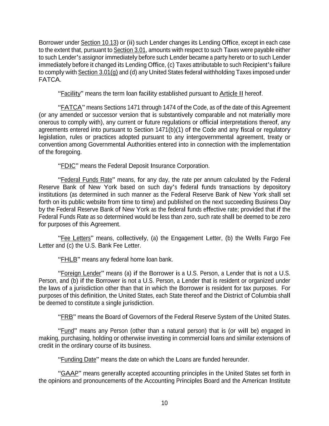 10 Borrower under Section 10.13) or (ii) such Lender changes its Lending Office, except in each case to the extent that, pursuant to Section 3.01, amounts with respect to such Taxes were payable either to such Lender’s assignor immediately before such Lender became a party hereto or to such Lender immediately before it changed its Lending Office, (c) Taxes attributable to such Recipient’s failure to comply with Section 3.01(g) and (d) any United States federal withholding Taxes imposed under FATCA. “Facility” means the term loan facility established pursuant to Article II hereof. “FATCA” means Sections 1471 through 1474 of the Code, as of the date of this Agreement (or any amended or successor version that is substantively comparable and not materially more onerous to comply with), any current or future regulations or official interpretations thereof, any agreements entered into pursuant to Section 1471(b)(1) of the Code and any fiscal or regulatory legislation, rules or practices adopted pursuant to any intergovernmental agreement, treaty or convention among Governmental Authorities entered into in connection with the implementation of the foregoing. “FDIC” means the Federal Deposit Insurance Corporation. “Federal Funds Rate” means, for any day, the rate per annum calculated by the Federal Reserve Bank of New York based on such day’s federal funds transactions by depository institutions (as determined in such manner as the Federal Reserve Bank of New York shall set forth on its public website from time to time) and published on the next succeeding Business Day by the Federal Reserve Bank of New York as the federal funds effective rate; provided that if the Federal Funds Rate as so determined would be less than zero, such rate shall be deemed to be zero for purposes of this Agreement. “Fee Letters” means, collectively, (a) the Engagement Letter, (b) the Wells Fargo Fee Letter and (c) the U.S. Bank Fee Letter. “FHLB” means any federal home loan bank. “Foreign Lender” means (a) if the Borrower is a U.S. Person, a Lender that is not a U.S. Person, and (b) if the Borrower is not a U.S. Person, a Lender that is resident or organized under the laws of a jurisdiction other than that in which the Borrower is resident for tax purposes. For purposes of this definition, the United States, each State thereof and the District of Columbia shall be deemed to constitute a single jurisdiction. “FRB” means the Board of Governors of the Federal Reserve System of the United States. “Fund” means any Person (other than a natural person) that is (or will be) engaged in making, purchasing, holding or otherwise investing in commercial loans and similar extensions of credit in the ordinary course of its business. “Funding Date” means the date on which the Loans are funded hereunder. “GAAP” means generally accepted accounting principles in the United States set forth in the opinions and pronouncements of the Accounting Principles Board and the American Institute