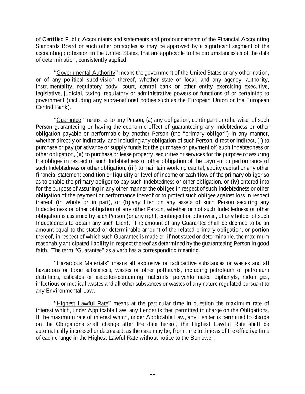 11 of Certified Public Accountants and statements and pronouncements of the Financial Accounting Standards Board or such other principles as may be approved by a significant segment of the accounting profession in the United States, that are applicable to the circumstances as of the date of determination, consistently applied. “Governmental Authority” means the government of the United States or any other nation, or of any political subdivision thereof, whether state or local, and any agency, authority, instrumentality, regulatory body, court, central bank or other entity exercising executive, legislative, judicial, taxing, regulatory or administrative powers or functions of or pertaining to government (including any supra-national bodies such as the European Union or the European Central Bank). “Guarantee” means, as to any Person, (a) any obligation, contingent or otherwise, of such Person guaranteeing or having the economic effect of guaranteeing any Indebtedness or other obligation payable or performable by another Person (the “primary obligor”) in any manner, whether directly or indirectly, and including any obligation of such Person, direct or indirect, (i) to purchase or pay (or advance or supply funds for the purchase or payment of) such Indebtedness or other obligation, (ii) to purchase or lease property, securities or services for the purpose of assuring the obligee in respect of such Indebtedness or other obligation of the payment or performance of such Indebtedness or other obligation, (iii) to maintain working capital, equity capital or any other financial statement condition or liquidity or level of income or cash flow of the primary obligor so as to enable the primary obligor to pay such Indebtedness or other obligation, or (iv) entered into for the purpose of assuring in any other manner the obligee in respect of such Indebtedness or other obligation of the payment or performance thereof or to protect such obligee against loss in respect thereof (in whole or in part), or (b) any Lien on any assets of such Person securing any Indebtedness or other obligation of any other Person, whether or not such Indebtedness or other obligation is assumed by such Person (or any right, contingent or otherwise, of any holder of such Indebtedness to obtain any such Lien). The amount of any Guarantee shall be deemed to be an amount equal to the stated or determinable amount of the related primary obligation, or portion thereof, in respect of which such Guarantee is made or, if not stated or determinable, the maximum reasonably anticipated liability in respect thereof as determined by the guaranteeing Person in good faith. The term “Guarantee” as a verb has a corresponding meaning. “Hazardous Materials” means all explosive or radioactive substances or wastes and all hazardous or toxic substances, wastes or other pollutants, including petroleum or petroleum distillates, asbestos or asbestos-containing materials, polychlorinated biphenyls, radon gas, infectious or medical wastes and all other substances or wastes of any nature regulated pursuant to any Environmental Law. “Highest Lawful Rate” means at the particular time in question the maximum rate of interest which, under Applicable Law, any Lender is then permitted to charge on the Obligations. If the maximum rate of interest which, under Applicable Law, any Lender is permitted to charge on the Obligations shall change after the date hereof, the Highest Lawful Rate shall be automatically increased or decreased, as the case may be, from time to time as of the effective time of each change in the Highest Lawful Rate without notice to the Borrower.