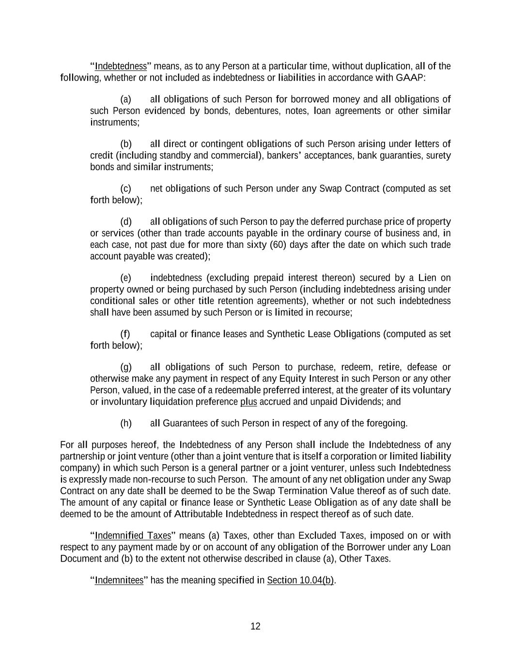 12 “Indebtedness” means, as to any Person at a particular time, without duplication, all of the following, whether or not included as indebtedness or liabilities in accordance with GAAP: (a) all obligations of such Person for borrowed money and all obligations of such Person evidenced by bonds, debentures, notes, loan agreements or other similar instruments; (b) all direct or contingent obligations of such Person arising under letters of credit (including standby and commercial), bankers’ acceptances, bank guaranties, surety bonds and similar instruments; (c) net obligations of such Person under any Swap Contract (computed as set forth below); (d) all obligations of such Person to pay the deferred purchase price of property or services (other than trade accounts payable in the ordinary course of business and, in each case, not past due for more than sixty (60) days after the date on which such trade account payable was created); (e) indebtedness (excluding prepaid interest thereon) secured by a Lien on property owned or being purchased by such Person (including indebtedness arising under conditional sales or other title retention agreements), whether or not such indebtedness shall have been assumed by such Person or is limited in recourse; (f) capital or finance leases and Synthetic Lease Obligations (computed as set forth below); (g) all obligations of such Person to purchase, redeem, retire, defease or otherwise make any payment in respect of any Equity Interest in such Person or any other Person, valued, in the case of a redeemable preferred interest, at the greater of its voluntary or involuntary liquidation preference plus accrued and unpaid Dividends; and (h) all Guarantees of such Person in respect of any of the foregoing. For all purposes hereof, the Indebtedness of any Person shall include the Indebtedness of any partnership or joint venture (other than a joint venture that is itself a corporation or limited liability company) in which such Person is a general partner or a joint venturer, unless such Indebtedness is expressly made non-recourse to such Person. The amount of any net obligation under any Swap Contract on any date shall be deemed to be the Swap Termination Value thereof as of such date. The amount of any capital or finance lease or Synthetic Lease Obligation as of any date shall be deemed to be the amount of Attributable Indebtedness in respect thereof as of such date. “Indemnified Taxes” means (a) Taxes, other than Excluded Taxes, imposed on or with respect to any payment made by or on account of any obligation of the Borrower under any Loan Document and (b) to the extent not otherwise described in clause (a), Other Taxes. “Indemnitees” has the meaning specified in Section 10.04(b).