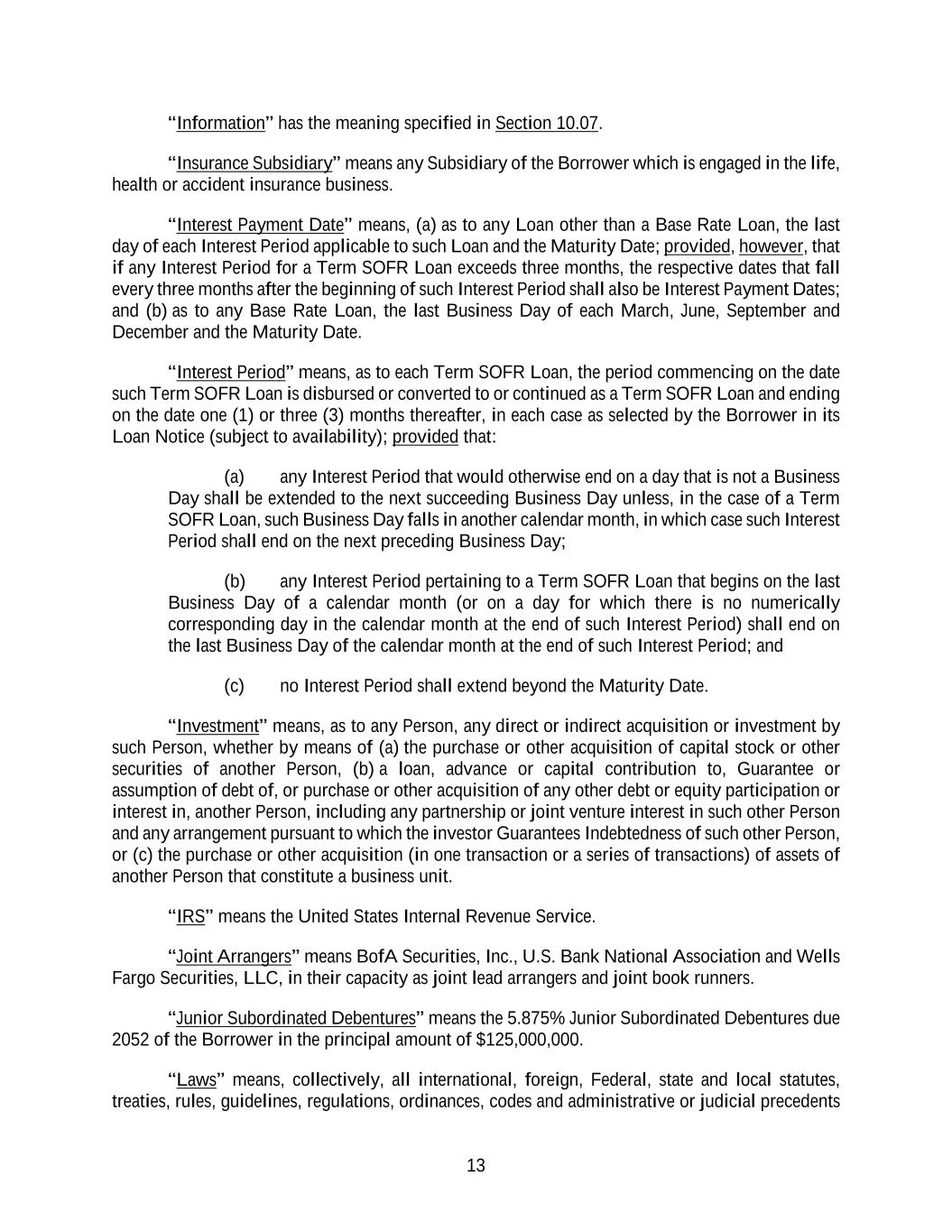 13 “Information” has the meaning specified in Section 10.07. “Insurance Subsidiary” means any Subsidiary of the Borrower which is engaged in the life, health or accident insurance business. “Interest Payment Date” means, (a) as to any Loan other than a Base Rate Loan, the last day of each Interest Period applicable to such Loan and the Maturity Date; provided, however, that if any Interest Period for a Term SOFR Loan exceeds three months, the respective dates that fall every three months after the beginning of such Interest Period shall also be Interest Payment Dates; and (b) as to any Base Rate Loan, the last Business Day of each March, June, September and December and the Maturity Date. “Interest Period” means, as to each Term SOFR Loan, the period commencing on the date such Term SOFR Loan is disbursed or converted to or continued as a Term SOFR Loan and ending on the date one (1) or three (3) months thereafter, in each case as selected by the Borrower in its Loan Notice (subject to availability); provided that: (a) any Interest Period that would otherwise end on a day that is not a Business Day shall be extended to the next succeeding Business Day unless, in the case of a Term SOFR Loan, such Business Day falls in another calendar month, in which case such Interest Period shall end on the next preceding Business Day; (b) any Interest Period pertaining to a Term SOFR Loan that begins on the last Business Day of a calendar month (or on a day for which there is no numerically corresponding day in the calendar month at the end of such Interest Period) shall end on the last Business Day of the calendar month at the end of such Interest Period; and (c) no Interest Period shall extend beyond the Maturity Date. “Investment” means, as to any Person, any direct or indirect acquisition or investment by such Person, whether by means of (a) the purchase or other acquisition of capital stock or other securities of another Person, (b) a loan, advance or capital contribution to, Guarantee or assumption of debt of, or purchase or other acquisition of any other debt or equity participation or interest in, another Person, including any partnership or joint venture interest in such other Person and any arrangement pursuant to which the investor Guarantees Indebtedness of such other Person, or (c) the purchase or other acquisition (in one transaction or a series of transactions) of assets of another Person that constitute a business unit. “IRS” means the United States Internal Revenue Service. “Joint Arrangers” means BofA Securities, Inc., U.S. Bank National Association and Wells Fargo Securities, LLC, in their capacity as joint lead arrangers and joint book runners. “Junior Subordinated Debentures” means the 5.875% Junior Subordinated Debentures due 2052 of the Borrower in the principal amount of $125,000,000. “Laws” means, collectively, all international, foreign, Federal, state and local statutes, treaties, rules, guidelines, regulations, ordinances, codes and administrative or judicial precedents