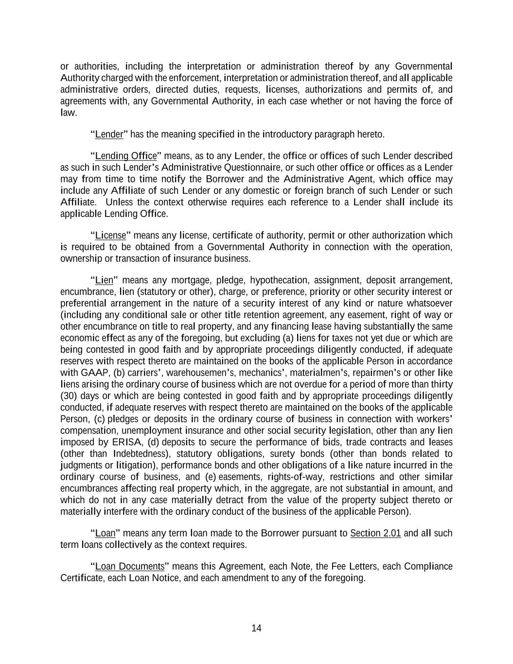 14 or authorities, including the interpretation or administration thereof by any Governmental Authority charged with the enforcement, interpretation or administration thereof, and all applicable administrative orders, directed duties, requests, licenses, authorizations and permits of, and agreements with, any Governmental Authority, in each case whether or not having the force of law. “Lender” has the meaning specified in the introductory paragraph hereto. “Lending Office” means, as to any Lender, the office or offices of such Lender described as such in such Lender’s Administrative Questionnaire, or such other office or offices as a Lender may from time to time notify the Borrower and the Administrative Agent, which office may include any Affiliate of such Lender or any domestic or foreign branch of such Lender or such Affiliate. Unless the context otherwise requires each reference to a Lender shall include its applicable Lending Office. “License” means any license, certificate of authority, permit or other authorization which is required to be obtained from a Governmental Authority in connection with the operation, ownership or transaction of insurance business. “Lien” means any mortgage, pledge, hypothecation, assignment, deposit arrangement, encumbrance, lien (statutory or other), charge, or preference, priority or other security interest or preferential arrangement in the nature of a security interest of any kind or nature whatsoever (including any conditional sale or other title retention agreement, any easement, right of way or other encumbrance on title to real property, and any financing lease having substantially the same economic effect as any of the foregoing, but excluding (a) liens for taxes not yet due or which are being contested in good faith and by appropriate proceedings diligently conducted, if adequate reserves with respect thereto are maintained on the books of the applicable Person in accordance with GAAP, (b) carriers’, warehousemen’s, mechanics’, materialmen’s, repairmen’s or other like liens arising the ordinary course of business which are not overdue for a period of more than thirty (30) days or which are being contested in good faith and by appropriate proceedings diligently conducted, if adequate reserves with respect thereto are maintained on the books of the applicable Person, (c) pledges or deposits in the ordinary course of business in connection with workers’ compensation, unemployment insurance and other social security legislation, other than any lien imposed by ERISA, (d) deposits to secure the performance of bids, trade contracts and leases (other than Indebtedness), statutory obligations, surety bonds (other than bonds related to judgments or litigation), performance bonds and other obligations of a like nature incurred in the ordinary course of business, and (e) easements, rights-of-way, restrictions and other similar encumbrances affecting real property which, in the aggregate, are not substantial in amount, and which do not in any case materially detract from the value of the property subject thereto or materially interfere with the ordinary conduct of the business of the applicable Person). “Loan” means any term loan made to the Borrower pursuant to Section 2.01 and all such term loans collectively as the context requires. “Loan Documents” means this Agreement, each Note, the Fee Letters, each Compliance Certificate, each Loan Notice, and each amendment to any of the foregoing.