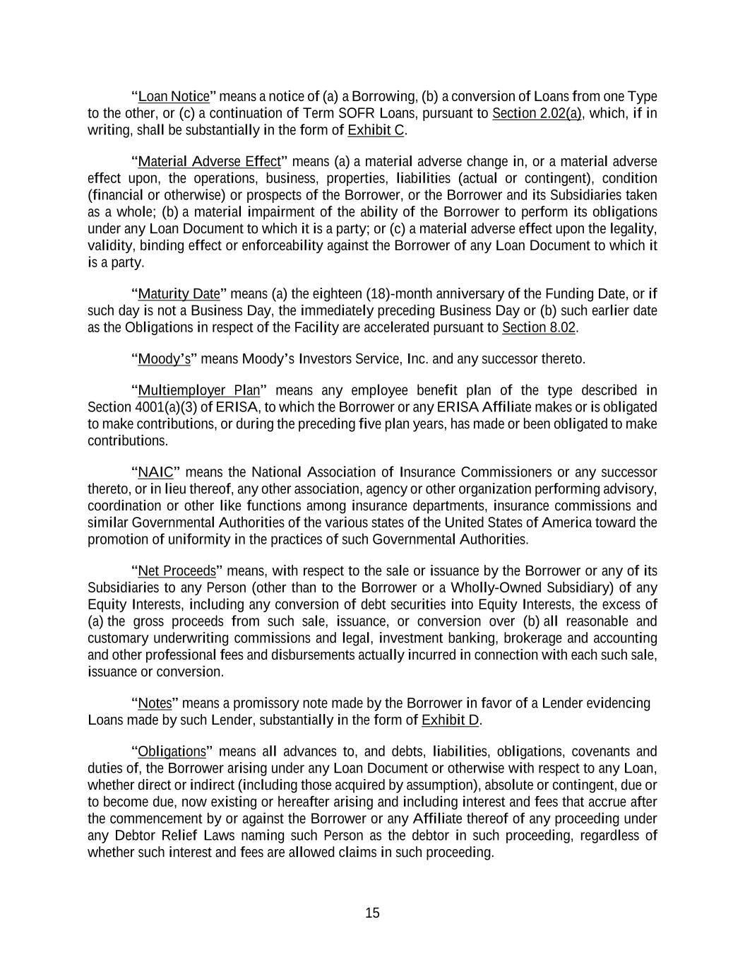 15 “Loan Notice” means a notice of (a) a Borrowing, (b) a conversion of Loans from one Type to the other, or (c) a continuation of Term SOFR Loans, pursuant to Section 2.02(a), which, if in writing, shall be substantially in the form of Exhibit C. “Material Adverse Effect” means (a) a material adverse change in, or a material adverse effect upon, the operations, business, properties, liabilities (actual or contingent), condition (financial or otherwise) or prospects of the Borrower, or the Borrower and its Subsidiaries taken as a whole; (b) a material impairment of the ability of the Borrower to perform its obligations under any Loan Document to which it is a party; or (c) a material adverse effect upon the legality, validity, binding effect or enforceability against the Borrower of any Loan Document to which it is a party. “Maturity Date” means (a) the eighteen (18)-month anniversary of the Funding Date, or if such day is not a Business Day, the immediately preceding Business Day or (b) such earlier date as the Obligations in respect of the Facility are accelerated pursuant to Section 8.02. “Moody’s” means Moody’s Investors Service, Inc. and any successor thereto. “Multiemployer Plan” means any employee benefit plan of the type described in Section 4001(a)(3) of ERISA, to which the Borrower or any ERISA Affiliate makes or is obligated to make contributions, or during the preceding five plan years, has made or been obligated to make contributions. “NAIC” means the National Association of Insurance Commissioners or any successor thereto, or in lieu thereof, any other association, agency or other organization performing advisory, coordination or other like functions among insurance departments, insurance commissions and similar Governmental Authorities of the various states of the United States of America toward the promotion of uniformity in the practices of such Governmental Authorities. “Net Proceeds” means, with respect to the sale or issuance by the Borrower or any of its Subsidiaries to any Person (other than to the Borrower or a Wholly-Owned Subsidiary) of any Equity Interests, including any conversion of debt securities into Equity Interests, the excess of (a) the gross proceeds from such sale, issuance, or conversion over (b) all reasonable and customary underwriting commissions and legal, investment banking, brokerage and accounting and other professional fees and disbursements actually incurred in connection with each such sale, issuance or conversion. “Notes” means a promissory note made by the Borrower in favor of a Lender evidencing Loans made by such Lender, substantially in the form of Exhibit D. “Obligations” means all advances to, and debts, liabilities, obligations, covenants and duties of, the Borrower arising under any Loan Document or otherwise with respect to any Loan, whether direct or indirect (including those acquired by assumption), absolute or contingent, due or to become due, now existing or hereafter arising and including interest and fees that accrue after the commencement by or against the Borrower or any Affiliate thereof of any proceeding under any Debtor Relief Laws naming such Person as the debtor in such proceeding, regardless of whether such interest and fees are allowed claims in such proceeding.