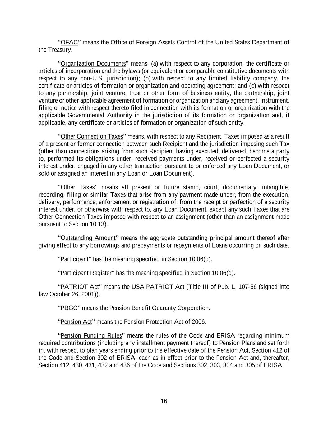 16 “OFAC” means the Office of Foreign Assets Control of the United States Department of the Treasury. “Organization Documents” means, (a) with respect to any corporation, the certificate or articles of incorporation and the bylaws (or equivalent or comparable constitutive documents with respect to any non-U.S. jurisdiction); (b) with respect to any limited liability company, the certificate or articles of formation or organization and operating agreement; and (c) with respect to any partnership, joint venture, trust or other form of business entity, the partnership, joint venture or other applicable agreement of formation or organization and any agreement, instrument, filing or notice with respect thereto filed in connection with its formation or organization with the applicable Governmental Authority in the jurisdiction of its formation or organization and, if applicable, any certificate or articles of formation or organization of such entity. “Other Connection Taxes” means, with respect to any Recipient, Taxes imposed as a result of a present or former connection between such Recipient and the jurisdiction imposing such Tax (other than connections arising from such Recipient having executed, delivered, become a party to, performed its obligations under, received payments under, received or perfected a security interest under, engaged in any other transaction pursuant to or enforced any Loan Document, or sold or assigned an interest in any Loan or Loan Document). “Other Taxes” means all present or future stamp, court, documentary, intangible, recording, filing or similar Taxes that arise from any payment made under, from the execution, delivery, performance, enforcement or registration of, from the receipt or perfection of a security interest under, or otherwise with respect to, any Loan Document, except any such Taxes that are Other Connection Taxes imposed with respect to an assignment (other than an assignment made pursuant to Section 10.13). “Outstanding Amount” means the aggregate outstanding principal amount thereof after giving effect to any borrowings and prepayments or repayments of Loans occurring on such date. “Participant” has the meaning specified in Section 10.06(d). “Participant Register” has the meaning specified in Section 10.06(d). “PATRIOT Act” means the USA PATRIOT Act (Title III of Pub. L. 107-56 (signed into law October 26, 2001)). “PBGC” means the Pension Benefit Guaranty Corporation. “Pension Act” means the Pension Protection Act of 2006. “Pension Funding Rules” means the rules of the Code and ERISA regarding minimum required contributions (including any installment payment thereof) to Pension Plans and set forth in, with respect to plan years ending prior to the effective date of the Pension Act, Section 412 of the Code and Section 302 of ERISA, each as in effect prior to the Pension Act and, thereafter, Section 412, 430, 431, 432 and 436 of the Code and Sections 302, 303, 304 and 305 of ERISA.