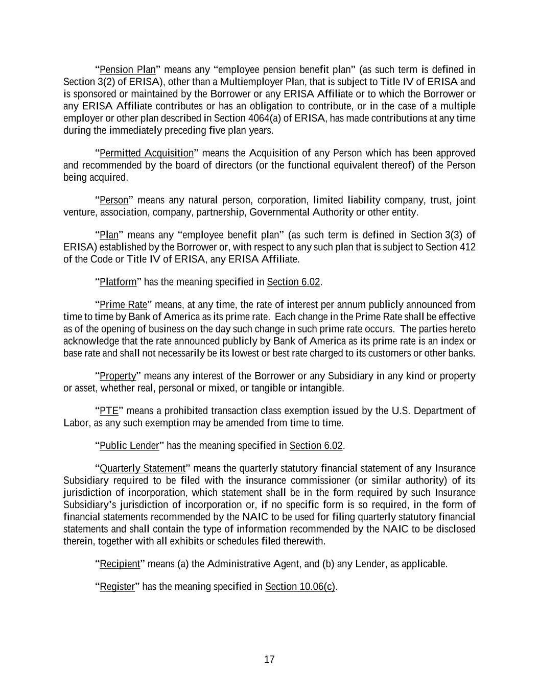17 “Pension Plan” means any “employee pension benefit plan” (as such term is defined in Section 3(2) of ERISA), other than a Multiemployer Plan, that is subject to Title IV of ERISA and is sponsored or maintained by the Borrower or any ERISA Affiliate or to which the Borrower or any ERISA Affiliate contributes or has an obligation to contribute, or in the case of a multiple employer or other plan described in Section 4064(a) of ERISA, has made contributions at any time during the immediately preceding five plan years. “Permitted Acquisition” means the Acquisition of any Person which has been approved and recommended by the board of directors (or the functional equivalent thereof) of the Person being acquired. “Person” means any natural person, corporation, limited liability company, trust, joint venture, association, company, partnership, Governmental Authority or other entity. “Plan” means any “employee benefit plan” (as such term is defined in Section 3(3) of ERISA) established by the Borrower or, with respect to any such plan that is subject to Section 412 of the Code or Title IV of ERISA, any ERISA Affiliate. “Platform” has the meaning specified in Section 6.02. “Prime Rate” means, at any time, the rate of interest per annum publicly announced from time to time by Bank of America as its prime rate. Each change in the Prime Rate shall be effective as of the opening of business on the day such change in such prime rate occurs. The parties hereto acknowledge that the rate announced publicly by Bank of America as its prime rate is an index or base rate and shall not necessarily be its lowest or best rate charged to its customers or other banks. “Property” means any interest of the Borrower or any Subsidiary in any kind or property or asset, whether real, personal or mixed, or tangible or intangible. “PTE” means a prohibited transaction class exemption issued by the U.S. Department of Labor, as any such exemption may be amended from time to time. “Public Lender” has the meaning specified in Section 6.02. “Quarterly Statement” means the quarterly statutory financial statement of any Insurance Subsidiary required to be filed with the insurance commissioner (or similar authority) of its jurisdiction of incorporation, which statement shall be in the form required by such Insurance Subsidiary’s jurisdiction of incorporation or, if no specific form is so required, in the form of financial statements recommended by the NAIC to be used for filing quarterly statutory financial statements and shall contain the type of information recommended by the NAIC to be disclosed therein, together with all exhibits or schedules filed therewith. “Recipient” means (a) the Administrative Agent, and (b) any Lender, as applicable. “Register” has the meaning specified in Section 10.06(c).