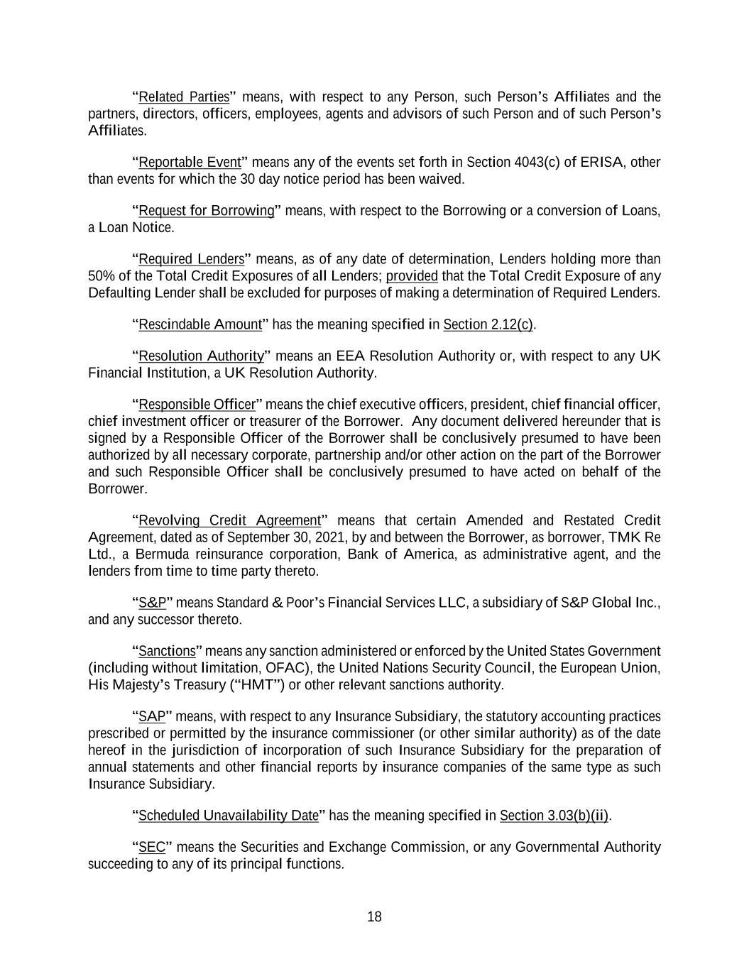 18 “Related Parties” means, with respect to any Person, such Person’s Affiliates and the partners, directors, officers, employees, agents and advisors of such Person and of such Person’s Affiliates. “Reportable Event” means any of the events set forth in Section 4043(c) of ERISA, other than events for which the 30 day notice period has been waived. “Request for Borrowing” means, with respect to the Borrowing or a conversion of Loans, a Loan Notice. “Required Lenders” means, as of any date of determination, Lenders holding more than 50% of the Total Credit Exposures of all Lenders; provided that the Total Credit Exposure of any Defaulting Lender shall be excluded for purposes of making a determination of Required Lenders. “Rescindable Amount” has the meaning specified in Section 2.12(c). “Resolution Authority” means an EEA Resolution Authority or, with respect to any UK Financial Institution, a UK Resolution Authority. “Responsible Officer” means the chief executive officers, president, chief financial officer, chief investment officer or treasurer of the Borrower. Any document delivered hereunder that is signed by a Responsible Officer of the Borrower shall be conclusively presumed to have been authorized by all necessary corporate, partnership and/or other action on the part of the Borrower and such Responsible Officer shall be conclusively presumed to have acted on behalf of the Borrower. “Revolving Credit Agreement” means that certain Amended and Restated Credit Agreement, dated as of September 30, 2021, by and between the Borrower, as borrower, TMK Re Ltd., a Bermuda reinsurance corporation, Bank of America, as administrative agent, and the lenders from time to time party thereto. “S&P” means Standard & Poor’s Financial Services LLC, a subsidiary of S&P Global Inc., and any successor thereto. “Sanctions” means any sanction administered or enforced by the United States Government (including without limitation, OFAC), the United Nations Security Council, the European Union, His Majesty’s Treasury (“HMT”) or other relevant sanctions authority. “SAP” means, with respect to any Insurance Subsidiary, the statutory accounting practices prescribed or permitted by the insurance commissioner (or other similar authority) as of the date hereof in the jurisdiction of incorporation of such Insurance Subsidiary for the preparation of annual statements and other financial reports by insurance companies of the same type as such Insurance Subsidiary. “Scheduled Unavailability Date” has the meaning specified in Section 3.03(b)(ii). “SEC” means the Securities and Exchange Commission, or any Governmental Authority succeeding to any of its principal functions.