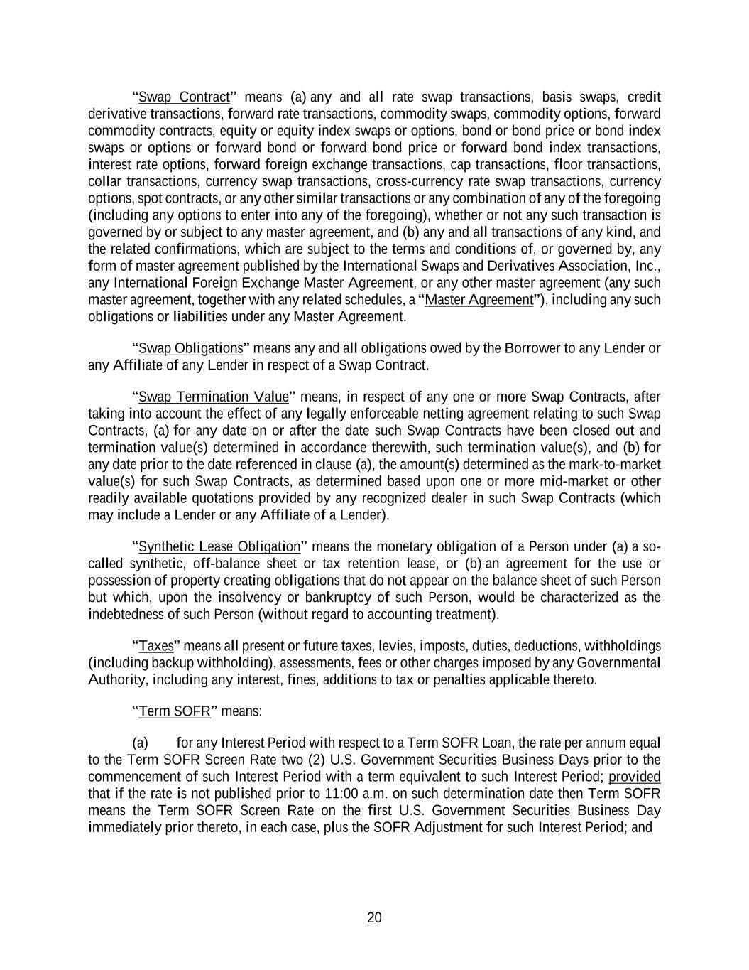 20 “Swap Contract” means (a) any and all rate swap transactions, basis swaps, credit derivative transactions, forward rate transactions, commodity swaps, commodity options, forward commodity contracts, equity or equity index swaps or options, bond or bond price or bond index swaps or options or forward bond or forward bond price or forward bond index transactions, interest rate options, forward foreign exchange transactions, cap transactions, floor transactions, collar transactions, currency swap transactions, cross-currency rate swap transactions, currency options, spot contracts, or any other similar transactions or any combination of any of the foregoing (including any options to enter into any of the foregoing), whether or not any such transaction is governed by or subject to any master agreement, and (b) any and all transactions of any kind, and the related confirmations, which are subject to the terms and conditions of, or governed by, any form of master agreement published by the International Swaps and Derivatives Association, Inc., any International Foreign Exchange Master Agreement, or any other master agreement (any such master agreement, together with any related schedules, a “Master Agreement”), including any such obligations or liabilities under any Master Agreement. “Swap Obligations” means any and all obligations owed by the Borrower to any Lender or any Affiliate of any Lender in respect of a Swap Contract. “Swap Termination Value” means, in respect of any one or more Swap Contracts, after taking into account the effect of any legally enforceable netting agreement relating to such Swap Contracts, (a) for any date on or after the date such Swap Contracts have been closed out and termination value(s) determined in accordance therewith, such termination value(s), and (b) for any date prior to the date referenced in clause (a), the amount(s) determined as the mark-to-market value(s) for such Swap Contracts, as determined based upon one or more mid-market or other readily available quotations provided by any recognized dealer in such Swap Contracts (which may include a Lender or any Affiliate of a Lender). “Synthetic Lease Obligation” means the monetary obligation of a Person under (a) a so- called synthetic, off-balance sheet or tax retention lease, or (b) an agreement for the use or possession of property creating obligations that do not appear on the balance sheet of such Person but which, upon the insolvency or bankruptcy of such Person, would be characterized as the indebtedness of such Person (without regard to accounting treatment). “Taxes” means all present or future taxes, levies, imposts, duties, deductions, withholdings (including backup withholding), assessments, fees or other charges imposed by any Governmental Authority, including any interest, fines, additions to tax or penalties applicable thereto. “Term SOFR” means: (a) for any Interest Period with respect to a Term SOFR Loan, the rate per annum equal to the Term SOFR Screen Rate two (2) U.S. Government Securities Business Days prior to the commencement of such Interest Period with a term equivalent to such Interest Period; provided that if the rate is not published prior to 11:00 a.m. on such determination date then Term SOFR means the Term SOFR Screen Rate on the first U.S. Government Securities Business Day immediately prior thereto, in each case, plus the SOFR Adjustment for such Interest Period; and
