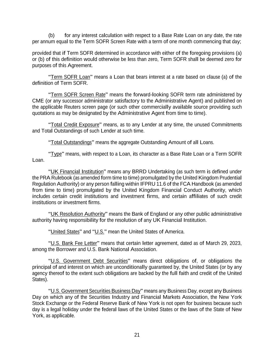 21 (b) for any interest calculation with respect to a Base Rate Loan on any date, the rate per annum equal to the Term SOFR Screen Rate with a term of one month commencing that day; provided that if Term SOFR determined in accordance with either of the foregoing provisions (a) or (b) of this definition would otherwise be less than zero, Term SOFR shall be deemed zero for purposes of this Agreement. “Term SOFR Loan” means a Loan that bears interest at a rate based on clause (a) of the definition of Term SOFR. “Term SOFR Screen Rate” means the forward-looking SOFR term rate administered by CME (or any successor administrator satisfactory to the Administrative Agent) and published on the applicable Reuters screen page (or such other commercially available source providing such quotations as may be designated by the Administrative Agent from time to time). “Total Credit Exposure” means, as to any Lender at any time, the unused Commitments and Total Outstandings of such Lender at such time. “Total Outstandings” means the aggregate Outstanding Amount of all Loans. “Type” means, with respect to a Loan, its character as a Base Rate Loan or a Term SOFR Loan. “UK Financial Institution” means any BRRD Undertaking (as such term is defined under the PRA Rulebook (as amended form time to time) promulgated by the United Kingdom Prudential Regulation Authority) or any person falling within IFPRU 11.6 of the FCA Handbook (as amended from time to time) promulgated by the United Kingdom Financial Conduct Authority, which includes certain credit institutions and investment firms, and certain affiliates of such credit institutions or investment firms. “UK Resolution Authority” means the Bank of England or any other public administrative authority having responsibility for the resolution of any UK Financial Institution. “United States” and “U.S.” mean the United States of America. “U.S. Bank Fee Letter” means that certain letter agreement, dated as of March 29, 2023, among the Borrower and U.S. Bank National Association. “U.S. Government Debt Securities” means direct obligations of, or obligations the principal of and interest on which are unconditionally guaranteed by, the United States (or by any agency thereof to the extent such obligations are backed by the full faith and credit of the United States). “U.S. Government Securities Business Day” means any Business Day, except any Business Day on which any of the Securities Industry and Financial Markets Association, the New York Stock Exchange or the Federal Reserve Bank of New York is not open for business because such day is a legal holiday under the federal laws of the United States or the laws of the State of New York, as applicable.