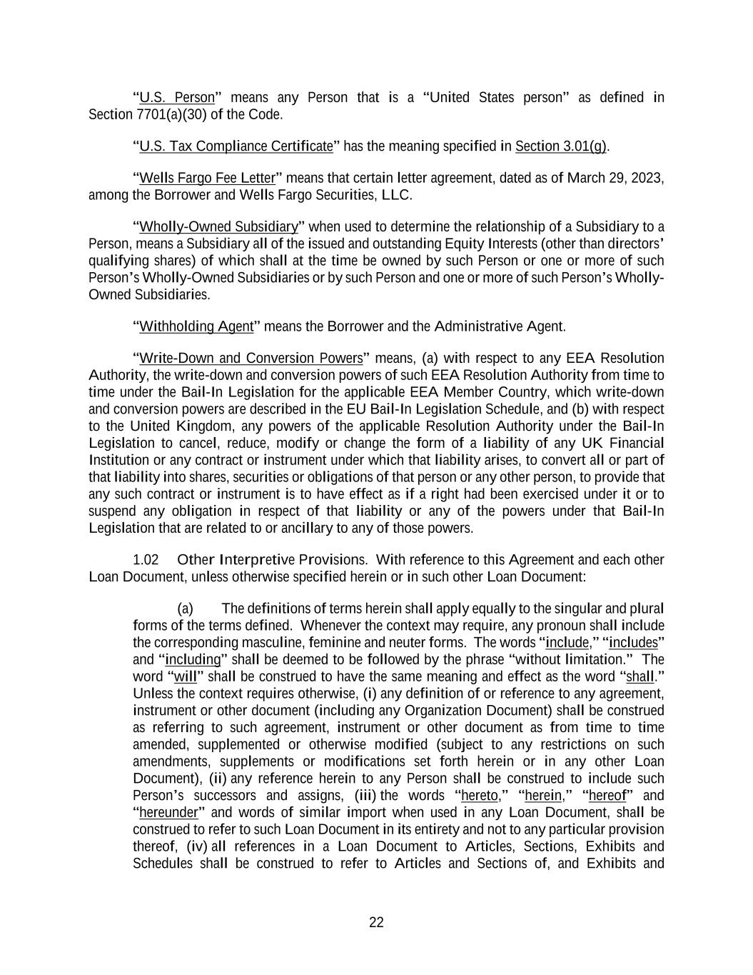22 “U.S. Person” means any Person that is a “United States person” as defined in Section 7701(a)(30) of the Code. “U.S. Tax Compliance Certificate” has the meaning specified in Section 3.01(g). “Wells Fargo Fee Letter” means that certain letter agreement, dated as of March 29, 2023, among the Borrower and Wells Fargo Securities, LLC. “Wholly-Owned Subsidiary” when used to determine the relationship of a Subsidiary to a Person, means a Subsidiary all of the issued and outstanding Equity Interests (other than directors’ qualifying shares) of which shall at the time be owned by such Person or one or more of such Person’s Wholly-Owned Subsidiaries or by such Person and one or more of such Person’s Wholly- Owned Subsidiaries. “Withholding Agent” means the Borrower and the Administrative Agent. “Write-Down and Conversion Powers” means, (a) with respect to any EEA Resolution Authority, the write-down and conversion powers of such EEA Resolution Authority from time to time under the Bail-In Legislation for the applicable EEA Member Country, which write-down and conversion powers are described in the EU Bail-In Legislation Schedule, and (b) with respect to the United Kingdom, any powers of the applicable Resolution Authority under the Bail-In Legislation to cancel, reduce, modify or change the form of a liability of any UK Financial Institution or any contract or instrument under which that liability arises, to convert all or part of that liability into shares, securities or obligations of that person or any other person, to provide that any such contract or instrument is to have effect as if a right had been exercised under it or to suspend any obligation in respect of that liability or any of the powers under that Bail-In Legislation that are related to or ancillary to any of those powers. 1.02 Other Interpretive Provisions. With reference to this Agreement and each other Loan Document, unless otherwise specified herein or in such other Loan Document: (a) The definitions of terms herein shall apply equally to the singular and plural forms of the terms defined. Whenever the context may require, any pronoun shall include the corresponding masculine, feminine and neuter forms. The words “include,” “includes” and “including” shall be deemed to be followed by the phrase “without limitation.” The word “will” shall be construed to have the same meaning and effect as the word “shall.” Unless the context requires otherwise, (i) any definition of or reference to any agreement, instrument or other document (including any Organization Document) shall be construed as referring to such agreement, instrument or other document as from time to time amended, supplemented or otherwise modified (subject to any restrictions on such amendments, supplements or modifications set forth herein or in any other Loan Document), (ii) any reference herein to any Person shall be construed to include such Person’s successors and assigns, (iii) the words “hereto,” “herein,” “hereof” and “hereunder” and words of similar import when used in any Loan Document, shall be construed to refer to such Loan Document in its entirety and not to any particular provision thereof, (iv) all references in a Loan Document to Articles, Sections, Exhibits and Schedules shall be construed to refer to Articles and Sections of, and Exhibits and