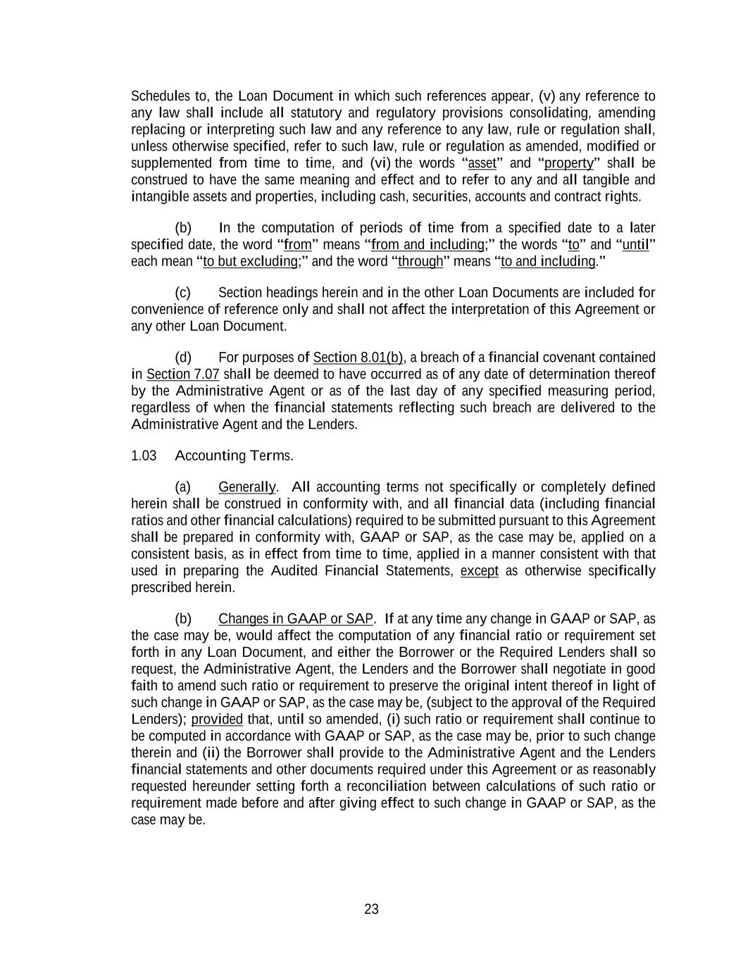 23 Schedules to, the Loan Document in which such references appear, (v) any reference to any law shall include all statutory and regulatory provisions consolidating, amending replacing or interpreting such law and any reference to any law, rule or regulation shall, unless otherwise specified, refer to such law, rule or regulation as amended, modified or supplemented from time to time, and (vi) the words “asset” and “property” shall be construed to have the same meaning and effect and to refer to any and all tangible and intangible assets and properties, including cash, securities, accounts and contract rights. (b) In the computation of periods of time from a specified date to a later specified date, the word “from” means “from and including;” the words “to” and “until” each mean “to but excluding;” and the word “through” means “to and including.” (c) Section headings herein and in the other Loan Documents are included for convenience of reference only and shall not affect the interpretation of this Agreement or any other Loan Document. (d) For purposes of Section 8.01(b), a breach of a financial covenant contained in Section 7.07 shall be deemed to have occurred as of any date of determination thereof by the Administrative Agent or as of the last day of any specified measuring period, regardless of when the financial statements reflecting such breach are delivered to the Administrative Agent and the Lenders. 1.03 Accounting Terms. (a) Generally. All accounting terms not specifically or completely defined herein shall be construed in conformity with, and all financial data (including financial ratios and other financial calculations) required to be submitted pursuant to this Agreement shall be prepared in conformity with, GAAP or SAP, as the case may be, applied on a consistent basis, as in effect from time to time, applied in a manner consistent with that used in preparing the Audited Financial Statements, except as otherwise specifically prescribed herein. (b) Changes in GAAP or SAP. If at any time any change in GAAP or SAP, as the case may be, would affect the computation of any financial ratio or requirement set forth in any Loan Document, and either the Borrower or the Required Lenders shall so request, the Administrative Agent, the Lenders and the Borrower shall negotiate in good faith to amend such ratio or requirement to preserve the original intent thereof in light of such change in GAAP or SAP, as the case may be, (subject to the approval of the Required Lenders); provided that, until so amended, (i) such ratio or requirement shall continue to be computed in accordance with GAAP or SAP, as the case may be, prior to such change therein and (ii) the Borrower shall provide to the Administrative Agent and the Lenders financial statements and other documents required under this Agreement or as reasonably requested hereunder setting forth a reconciliation between calculations of such ratio or requirement made before and after giving effect to such change in GAAP or SAP, as the case may be.