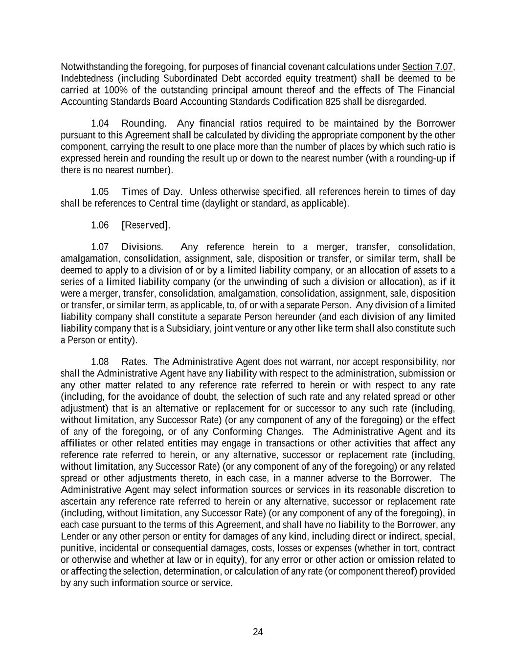 24 Notwithstanding the foregoing, for purposes of financial covenant calculations under Section 7.07, Indebtedness (including Subordinated Debt accorded equity treatment) shall be deemed to be carried at 100% of the outstanding principal amount thereof and the effects of The Financial Accounting Standards Board Accounting Standards Codification 825 shall be disregarded. 1.04 Rounding. Any financial ratios required to be maintained by the Borrower pursuant to this Agreement shall be calculated by dividing the appropriate component by the other component, carrying the result to one place more than the number of places by which such ratio is expressed herein and rounding the result up or down to the nearest number (with a rounding-up if there is no nearest number). 1.05 Times of Day. Unless otherwise specified, all references herein to times of day shall be references to Central time (daylight or standard, as applicable). 1.06 [Reserved]. 1.07 Divisions. Any reference herein to a merger, transfer, consolidation, amalgamation, consolidation, assignment, sale, disposition or transfer, or similar term, shall be deemed to apply to a division of or by a limited liability company, or an allocation of assets to a series of a limited liability company (or the unwinding of such a division or allocation), as if it were a merger, transfer, consolidation, amalgamation, consolidation, assignment, sale, disposition or transfer, or similar term, as applicable, to, of or with a separate Person. Any division of a limited liability company shall constitute a separate Person hereunder (and each division of any limited liability company that is a Subsidiary, joint venture or any other like term shall also constitute such a Person or entity). 1.08 Rates. The Administrative Agent does not warrant, nor accept responsibility, nor shall the Administrative Agent have any liability with respect to the administration, submission or any other matter related to any reference rate referred to herein or with respect to any rate (including, for the avoidance of doubt, the selection of such rate and any related spread or other adjustment) that is an alternative or replacement for or successor to any such rate (including, without limitation, any Successor Rate) (or any component of any of the foregoing) or the effect of any of the foregoing, or of any Conforming Changes. The Administrative Agent and its affiliates or other related entities may engage in transactions or other activities that affect any reference rate referred to herein, or any alternative, successor or replacement rate (including, without limitation, any Successor Rate) (or any component of any of the foregoing) or any related spread or other adjustments thereto, in each case, in a manner adverse to the Borrower. The Administrative Agent may select information sources or services in its reasonable discretion to ascertain any reference rate referred to herein or any alternative, successor or replacement rate (including, without limitation, any Successor Rate) (or any component of any of the foregoing), in each case pursuant to the terms of this Agreement, and shall have no liability to the Borrower, any Lender or any other person or entity for damages of any kind, including direct or indirect, special, punitive, incidental or consequential damages, costs, losses or expenses (whether in tort, contract or otherwise and whether at law or in equity), for any error or other action or omission related to or affecting the selection, determination, or calculation of any rate (or component thereof) provided by any such information source or service.