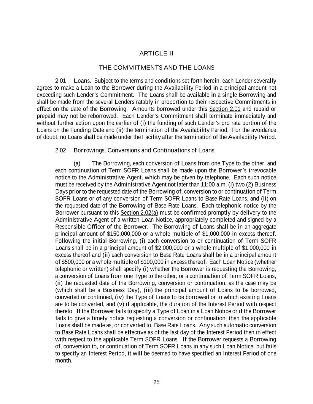 25 ARTICLE II THE COMMITMENTS AND THE LOANS 2.01 Loans. Subject to the terms and conditions set forth herein, each Lender severally agrees to make a Loan to the Borrower during the Availability Period in a principal amount not exceeding such Lender’s Commitment. The Loans shall be available in a single Borrowing and shall be made from the several Lenders ratably in proportion to their respective Commitments in effect on the date of the Borrowing. Amounts borrowed under this Section 2.01 and repaid or prepaid may not be reborrowed. Each Lender’s Commitment shall terminate immediately and without further action upon the earlier of (i) the funding of such Lender’s pro rata portion of the Loans on the Funding Date and (ii) the termination of the Availability Period. For the avoidance of doubt, no Loans shall be made under the Facility after the termination of the Availability Period. 2.02 Borrowings, Conversions and Continuations of Loans. (a) The Borrowing, each conversion of Loans from one Type to the other, and each continuation of Term SOFR Loans shall be made upon the Borrower’s irrevocable notice to the Administrative Agent, which may be given by telephone. Each such notice must be received by the Administrative Agent not later than 11:00 a.m. (i) two (2) Business Days prior to the requested date of the Borrowing of, conversion to or continuation of Term SOFR Loans or of any conversion of Term SOFR Loans to Base Rate Loans, and (ii) on the requested date of the Borrowing of Base Rate Loans. Each telephonic notice by the Borrower pursuant to this Section 2.02(a) must be confirmed promptly by delivery to the Administrative Agent of a written Loan Notice, appropriately completed and signed by a Responsible Officer of the Borrower. The Borrowing of Loans shall be in an aggregate principal amount of $150,000,000 or a whole multiple of $1,000,000 in excess thereof. Following the initial Borrowing, (i) each conversion to or continuation of Term SOFR Loans shall be in a principal amount of $2,000,000 or a whole multiple of $1,000,000 in excess thereof and (ii) each conversion to Base Rate Loans shall be in a principal amount of $500,000 or a whole multiple of $100,000 in excess thereof. Each Loan Notice (whether telephonic or written) shall specify (i) whether the Borrower is requesting the Borrowing, a conversion of Loans from one Type to the other, or a continuation of Term SOFR Loans, (ii) the requested date of the Borrowing, conversion or continuation, as the case may be (which shall be a Business Day), (iii) the principal amount of Loans to be borrowed, converted or continued, (iv) the Type of Loans to be borrowed or to which existing Loans are to be converted, and (v) if applicable, the duration of the Interest Period with respect thereto. If the Borrower fails to specify a Type of Loan in a Loan Notice or if the Borrower fails to give a timely notice requesting a conversion or continuation, then the applicable Loans shall be made as, or converted to, Base Rate Loans. Any such automatic conversion to Base Rate Loans shall be effective as of the last day of the Interest Period then in effect with respect to the applicable Term SOFR Loans. If the Borrower requests a Borrowing of, conversion to, or continuation of Term SOFR Loans in any such Loan Notice, but fails to specify an Interest Period, it will be deemed to have specified an Interest Period of one month.