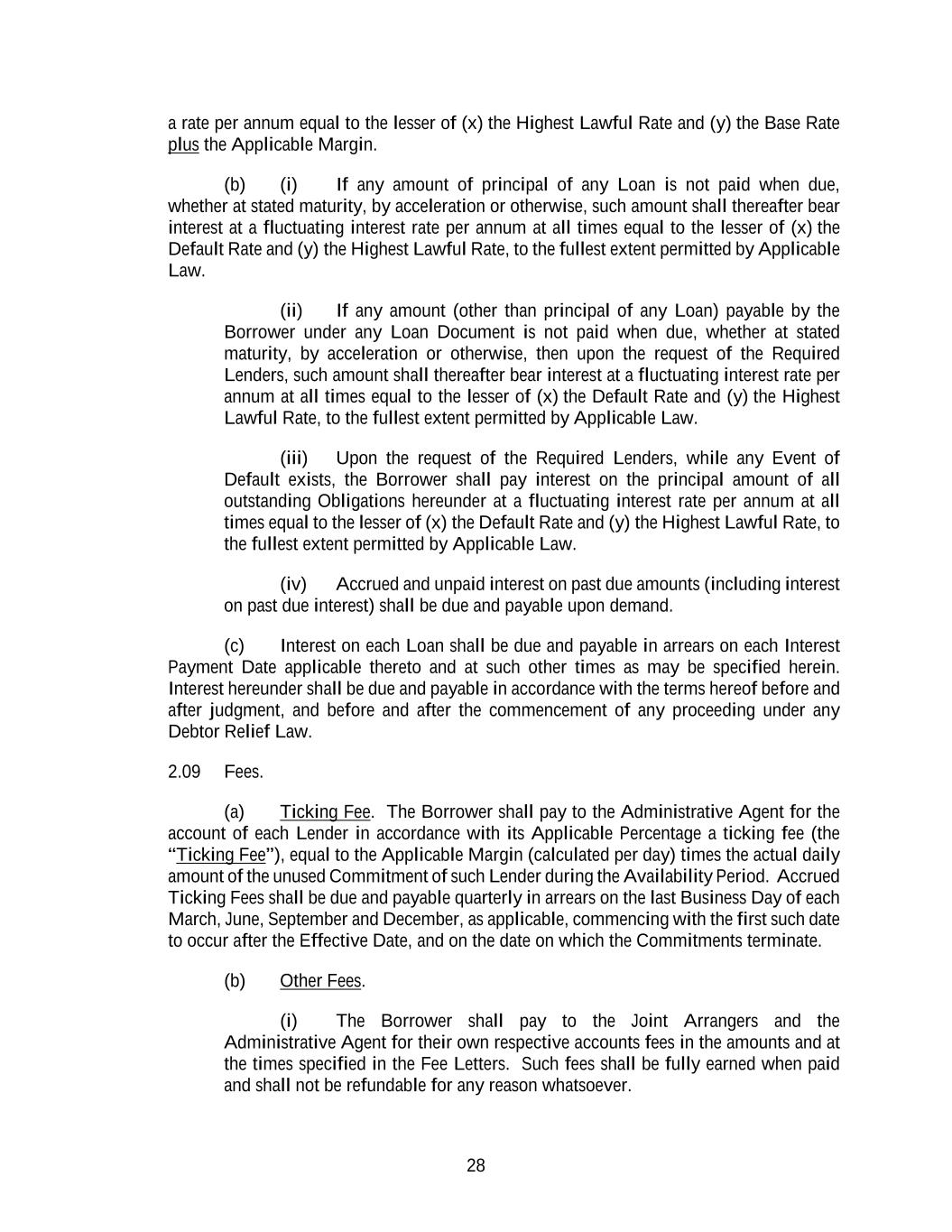 28 a rate per annum equal to the lesser of (x) the Highest Lawful Rate and (y) the Base Rate plus the Applicable Margin. (b) (i) If any amount of principal of any Loan is not paid when due, whether at stated maturity, by acceleration or otherwise, such amount shall thereafter bear interest at a fluctuating interest rate per annum at all times equal to the lesser of (x) the Default Rate and (y) the Highest Lawful Rate, to the fullest extent permitted by Applicable Law. (ii) If any amount (other than principal of any Loan) payable by the Borrower under any Loan Document is not paid when due, whether at stated maturity, by acceleration or otherwise, then upon the request of the Required Lenders, such amount shall thereafter bear interest at a fluctuating interest rate per annum at all times equal to the lesser of (x) the Default Rate and (y) the Highest Lawful Rate, to the fullest extent permitted by Applicable Law. (iii) Upon the request of the Required Lenders, while any Event of Default exists, the Borrower shall pay interest on the principal amount of all outstanding Obligations hereunder at a fluctuating interest rate per annum at all times equal to the lesser of (x) the Default Rate and (y) the Highest Lawful Rate, to the fullest extent permitted by Applicable Law. (iv) Accrued and unpaid interest on past due amounts (including interest on past due interest) shall be due and payable upon demand. (c) Interest on each Loan shall be due and payable in arrears on each Interest Payment Date applicable thereto and at such other times as may be specified herein. Interest hereunder shall be due and payable in accordance with the terms hereof before and after judgment, and before and after the commencement of any proceeding under any Debtor Relief Law. 2.09 Fees. (a) Ticking Fee. The Borrower shall pay to the Administrative Agent for the account of each Lender in accordance with its Applicable Percentage a ticking fee (the “Ticking Fee”), equal to the Applicable Margin (calculated per day) times the actual daily amount of the unused Commitment of such Lender during the Availability Period. Accrued Ticking Fees shall be due and payable quarterly in arrears on the last Business Day of each March, June, September and December, as applicable, commencing with the first such date to occur after the Effective Date, and on the date on which the Commitments terminate. (b) Other Fees. (i) The Borrower shall pay to the Joint Arrangers and the Administrative Agent for their own respective accounts fees in the amounts and at the times specified in the Fee Letters. Such fees shall be fully earned when paid and shall not be refundable for any reason whatsoever.