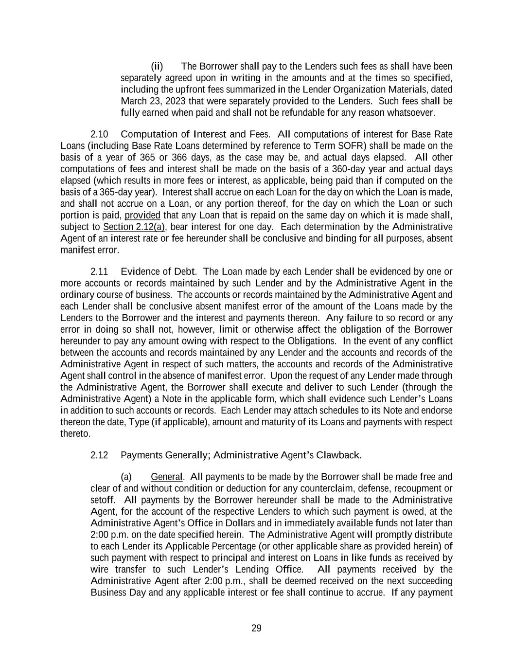 29 (ii) The Borrower shall pay to the Lenders such fees as shall have been separately agreed upon in writing in the amounts and at the times so specified, including the upfront fees summarized in the Lender Organization Materials, dated March 23, 2023 that were separately provided to the Lenders. Such fees shall be fully earned when paid and shall not be refundable for any reason whatsoever. 2.10 Computation of Interest and Fees. All computations of interest for Base Rate Loans (including Base Rate Loans determined by reference to Term SOFR) shall be made on the basis of a year of 365 or 366 days, as the case may be, and actual days elapsed. All other computations of fees and interest shall be made on the basis of a 360-day year and actual days elapsed (which results in more fees or interest, as applicable, being paid than if computed on the basis of a 365-day year). Interest shall accrue on each Loan for the day on which the Loan is made, and shall not accrue on a Loan, or any portion thereof, for the day on which the Loan or such portion is paid, provided that any Loan that is repaid on the same day on which it is made shall, subject to Section 2.12(a), bear interest for one day. Each determination by the Administrative Agent of an interest rate or fee hereunder shall be conclusive and binding for all purposes, absent manifest error. 2.11 Evidence of Debt. The Loan made by each Lender shall be evidenced by one or more accounts or records maintained by such Lender and by the Administrative Agent in the ordinary course of business. The accounts or records maintained by the Administrative Agent and each Lender shall be conclusive absent manifest error of the amount of the Loans made by the Lenders to the Borrower and the interest and payments thereon. Any failure to so record or any error in doing so shall not, however, limit or otherwise affect the obligation of the Borrower hereunder to pay any amount owing with respect to the Obligations. In the event of any conflict between the accounts and records maintained by any Lender and the accounts and records of the Administrative Agent in respect of such matters, the accounts and records of the Administrative Agent shall control in the absence of manifest error. Upon the request of any Lender made through the Administrative Agent, the Borrower shall execute and deliver to such Lender (through the Administrative Agent) a Note in the applicable form, which shall evidence such Lender’s Loans in addition to such accounts or records. Each Lender may attach schedules to its Note and endorse thereon the date, Type (if applicable), amount and maturity of its Loans and payments with respect thereto. 2.12 Payments Generally; Administrative Agent’s Clawback. (a) General. All payments to be made by the Borrower shall be made free and clear of and without condition or deduction for any counterclaim, defense, recoupment or setoff. All payments by the Borrower hereunder shall be made to the Administrative Agent, for the account of the respective Lenders to which such payment is owed, at the Administrative Agent’s Office in Dollars and in immediately available funds not later than 2:00 p.m. on the date specified herein. The Administrative Agent will promptly distribute to each Lender its Applicable Percentage (or other applicable share as provided herein) of such payment with respect to principal and interest on Loans in like funds as received by wire transfer to such Lender’s Lending Office. All payments received by the Administrative Agent after 2:00 p.m., shall be deemed received on the next succeeding Business Day and any applicable interest or fee shall continue to accrue. If any payment
