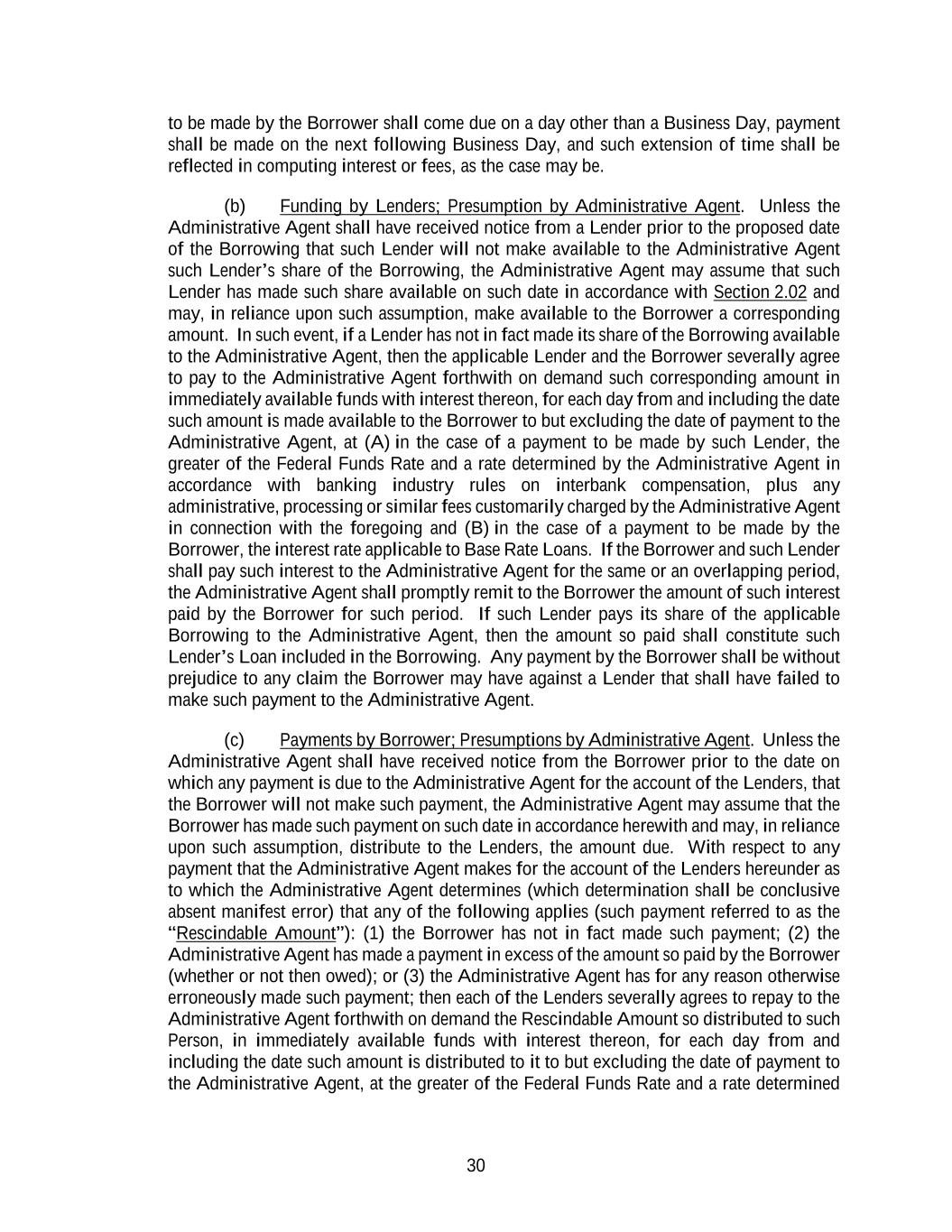 30 to be made by the Borrower shall come due on a day other than a Business Day, payment shall be made on the next following Business Day, and such extension of time shall be reflected in computing interest or fees, as the case may be. (b) Funding by Lenders; Presumption by Administrative Agent. Unless the Administrative Agent shall have received notice from a Lender prior to the proposed date of the Borrowing that such Lender will not make available to the Administrative Agent such Lender’s share of the Borrowing, the Administrative Agent may assume that such Lender has made such share available on such date in accordance with Section 2.02 and may, in reliance upon such assumption, make available to the Borrower a corresponding amount. In such event, if a Lender has not in fact made its share of the Borrowing available to the Administrative Agent, then the applicable Lender and the Borrower severally agree to pay to the Administrative Agent forthwith on demand such corresponding amount in immediately available funds with interest thereon, for each day from and including the date such amount is made available to the Borrower to but excluding the date of payment to the Administrative Agent, at (A) in the case of a payment to be made by such Lender, the greater of the Federal Funds Rate and a rate determined by the Administrative Agent in accordance with banking industry rules on interbank compensation, plus any administrative, processing or similar fees customarily charged by the Administrative Agent in connection with the foregoing and (B) in the case of a payment to be made by the Borrower, the interest rate applicable to Base Rate Loans. If the Borrower and such Lender shall pay such interest to the Administrative Agent for the same or an overlapping period, the Administrative Agent shall promptly remit to the Borrower the amount of such interest paid by the Borrower for such period. If such Lender pays its share of the applicable Borrowing to the Administrative Agent, then the amount so paid shall constitute such Lender’s Loan included in the Borrowing. Any payment by the Borrower shall be without prejudice to any claim the Borrower may have against a Lender that shall have failed to make such payment to the Administrative Agent. (c) Payments by Borrower; Presumptions by Administrative Agent. Unless the Administrative Agent shall have received notice from the Borrower prior to the date on which any payment is due to the Administrative Agent for the account of the Lenders, that the Borrower will not make such payment, the Administrative Agent may assume that the Borrower has made such payment on such date in accordance herewith and may, in reliance upon such assumption, distribute to the Lenders, the amount due. With respect to any payment that the Administrative Agent makes for the account of the Lenders hereunder as to which the Administrative Agent determines (which determination shall be conclusive absent manifest error) that any of the following applies (such payment referred to as the “Rescindable Amount”): (1) the Borrower has not in fact made such payment; (2) the Administrative Agent has made a payment in excess of the amount so paid by the Borrower (whether or not then owed); or (3) the Administrative Agent has for any reason otherwise erroneously made such payment; then each of the Lenders severally agrees to repay to the Administrative Agent forthwith on demand the Rescindable Amount so distributed to such Person, in immediately available funds with interest thereon, for each day from and including the date such amount is distributed to it to but excluding the date of payment to the Administrative Agent, at the greater of the Federal Funds Rate and a rate determined