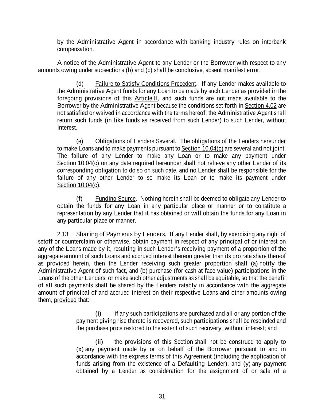 31 by the Administrative Agent in accordance with banking industry rules on interbank compensation. A notice of the Administrative Agent to any Lender or the Borrower with respect to any amounts owing under subsections (b) and (c) shall be conclusive, absent manifest error. (d) Failure to Satisfy Conditions Precedent. If any Lender makes available to the Administrative Agent funds for any Loan to be made by such Lender as provided in the foregoing provisions of this Article II, and such funds are not made available to the Borrower by the Administrative Agent because the conditions set forth in Section 4.02 are not satisfied or waived in accordance with the terms hereof, the Administrative Agent shall return such funds (in like funds as received from such Lender) to such Lender, without interest. (e) Obligations of Lenders Several. The obligations of the Lenders hereunder to make Loans and to make payments pursuant to Section 10.04(c) are several and not joint. The failure of any Lender to make any Loan or to make any payment under Section 10.04(c) on any date required hereunder shall not relieve any other Lender of its corresponding obligation to do so on such date, and no Lender shall be responsible for the failure of any other Lender to so make its Loan or to make its payment under Section 10.04(c). (f) Funding Source. Nothing herein shall be deemed to obligate any Lender to obtain the funds for any Loan in any particular place or manner or to constitute a representation by any Lender that it has obtained or will obtain the funds for any Loan in any particular place or manner. 2.13 Sharing of Payments by Lenders. If any Lender shall, by exercising any right of setoff or counterclaim or otherwise, obtain payment in respect of any principal of or interest on any of the Loans made by it, resulting in such Lender’s receiving payment of a proportion of the aggregate amount of such Loans and accrued interest thereon greater than its pro rata share thereof as provided herein, then the Lender receiving such greater proportion shall (a) notify the Administrative Agent of such fact, and (b) purchase (for cash at face value) participations in the Loans of the other Lenders, or make such other adjustments as shall be equitable, so that the benefit of all such payments shall be shared by the Lenders ratably in accordance with the aggregate amount of principal of and accrued interest on their respective Loans and other amounts owing them, provided that: (i) if any such participations are purchased and all or any portion of the payment giving rise thereto is recovered, such participations shall be rescinded and the purchase price restored to the extent of such recovery, without interest; and (ii) the provisions of this Section shall not be construed to apply to (x) any payment made by or on behalf of the Borrower pursuant to and in accordance with the express terms of this Agreement (including the application of funds arising from the existence of a Defaulting Lender), and (y) any payment obtained by a Lender as consideration for the assignment of or sale of a