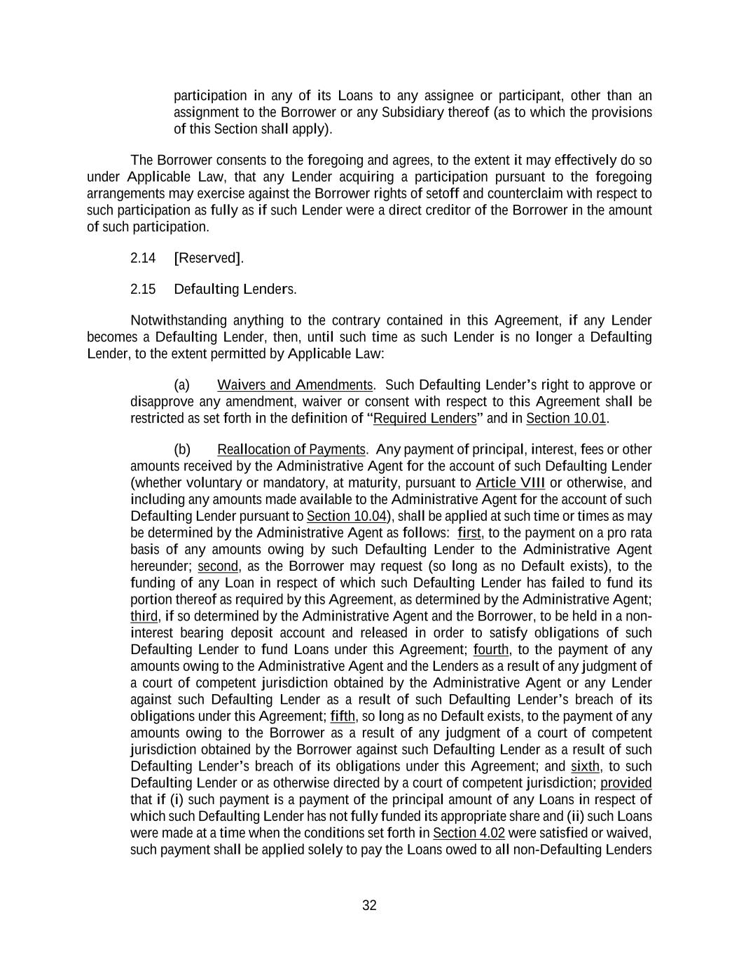 32 participation in any of its Loans to any assignee or participant, other than an assignment to the Borrower or any Subsidiary thereof (as to which the provisions of this Section shall apply). The Borrower consents to the foregoing and agrees, to the extent it may effectively do so under Applicable Law, that any Lender acquiring a participation pursuant to the foregoing arrangements may exercise against the Borrower rights of setoff and counterclaim with respect to such participation as fully as if such Lender were a direct creditor of the Borrower in the amount of such participation. 2.14 [Reserved]. 2.15 Defaulting Lenders. Notwithstanding anything to the contrary contained in this Agreement, if any Lender becomes a Defaulting Lender, then, until such time as such Lender is no longer a Defaulting Lender, to the extent permitted by Applicable Law: (a) Waivers and Amendments. Such Defaulting Lender’s right to approve or disapprove any amendment, waiver or consent with respect to this Agreement shall be restricted as set forth in the definition of “Required Lenders” and in Section 10.01. (b) Reallocation of Payments. Any payment of principal, interest, fees or other amounts received by the Administrative Agent for the account of such Defaulting Lender (whether voluntary or mandatory, at maturity, pursuant to Article VIII or otherwise, and including any amounts made available to the Administrative Agent for the account of such Defaulting Lender pursuant to Section 10.04), shall be applied at such time or times as may be determined by the Administrative Agent as follows: first, to the payment on a pro rata basis of any amounts owing by such Defaulting Lender to the Administrative Agent hereunder; second, as the Borrower may request (so long as no Default exists), to the funding of any Loan in respect of which such Defaulting Lender has failed to fund its portion thereof as required by this Agreement, as determined by the Administrative Agent; third, if so determined by the Administrative Agent and the Borrower, to be held in a non- interest bearing deposit account and released in order to satisfy obligations of such Defaulting Lender to fund Loans under this Agreement; fourth, to the payment of any amounts owing to the Administrative Agent and the Lenders as a result of any judgment of a court of competent jurisdiction obtained by the Administrative Agent or any Lender against such Defaulting Lender as a result of such Defaulting Lender’s breach of its obligations under this Agreement; fifth, so long as no Default exists, to the payment of any amounts owing to the Borrower as a result of any judgment of a court of competent jurisdiction obtained by the Borrower against such Defaulting Lender as a result of such Defaulting Lender’s breach of its obligations under this Agreement; and sixth, to such Defaulting Lender or as otherwise directed by a court of competent jurisdiction; provided that if (i) such payment is a payment of the principal amount of any Loans in respect of which such Defaulting Lender has not fully funded its appropriate share and (ii) such Loans were made at a time when the conditions set forth in Section 4.02 were satisfied or waived, such payment shall be applied solely to pay the Loans owed to all non-Defaulting Lenders