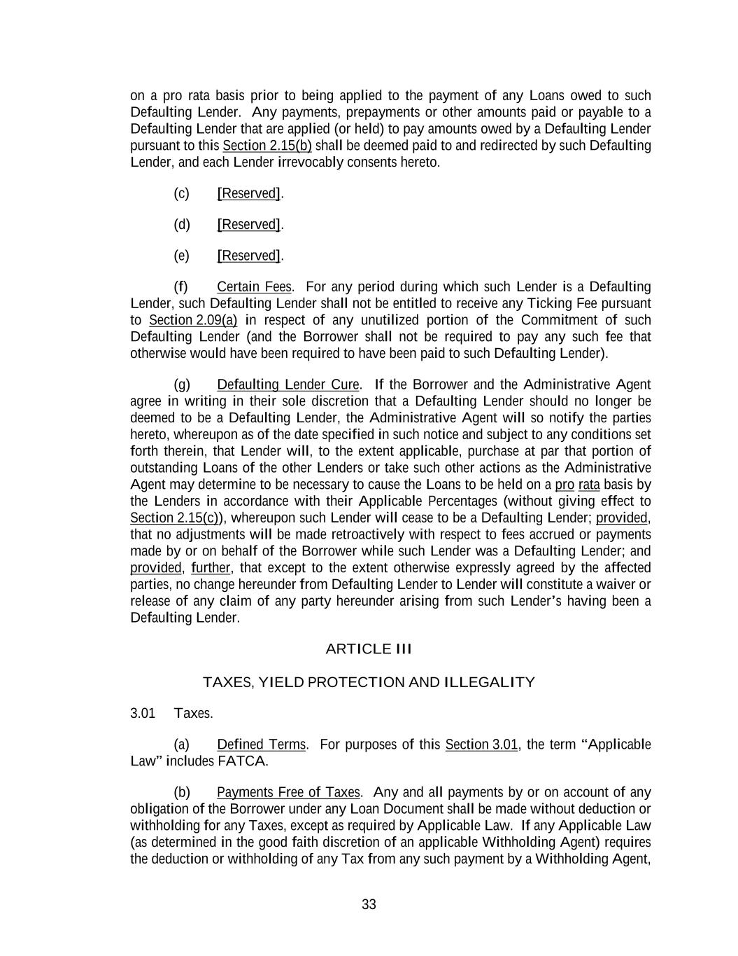 33 on a pro rata basis prior to being applied to the payment of any Loans owed to such Defaulting Lender. Any payments, prepayments or other amounts paid or payable to a Defaulting Lender that are applied (or held) to pay amounts owed by a Defaulting Lender pursuant to this Section 2.15(b) shall be deemed paid to and redirected by such Defaulting Lender, and each Lender irrevocably consents hereto. (c) [Reserved]. (d) [Reserved]. (e) [Reserved]. (f) Certain Fees. For any period during which such Lender is a Defaulting Lender, such Defaulting Lender shall not be entitled to receive any Ticking Fee pursuant to Section 2.09(a) in respect of any unutilized portion of the Commitment of such Defaulting Lender (and the Borrower shall not be required to pay any such fee that otherwise would have been required to have been paid to such Defaulting Lender). (g) Defaulting Lender Cure. If the Borrower and the Administrative Agent agree in writing in their sole discretion that a Defaulting Lender should no longer be deemed to be a Defaulting Lender, the Administrative Agent will so notify the parties hereto, whereupon as of the date specified in such notice and subject to any conditions set forth therein, that Lender will, to the extent applicable, purchase at par that portion of outstanding Loans of the other Lenders or take such other actions as the Administrative Agent may determine to be necessary to cause the Loans to be held on a pro rata basis by the Lenders in accordance with their Applicable Percentages (without giving effect to Section 2.15(c)), whereupon such Lender will cease to be a Defaulting Lender; provided, that no adjustments will be made retroactively with respect to fees accrued or payments made by or on behalf of the Borrower while such Lender was a Defaulting Lender; and provided, further, that except to the extent otherwise expressly agreed by the affected parties, no change hereunder from Defaulting Lender to Lender will constitute a waiver or release of any claim of any party hereunder arising from such Lender’s having been a Defaulting Lender. ARTICLE III TAXES, YIELD PROTECTION AND ILLEGALITY 3.01 Taxes. (a) Defined Terms. For purposes of this Section 3.01, the term “Applicable Law” includes FATCA. (b) Payments Free of Taxes. Any and all payments by or on account of any obligation of the Borrower under any Loan Document shall be made without deduction or withholding for any Taxes, except as required by Applicable Law. If any Applicable Law (as determined in the good faith discretion of an applicable Withholding Agent) requires the deduction or withholding of any Tax from any such payment by a Withholding Agent,