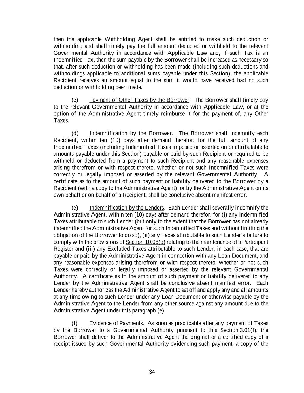 34 then the applicable Withholding Agent shall be entitled to make such deduction or withholding and shall timely pay the full amount deducted or withheld to the relevant Governmental Authority in accordance with Applicable Law and, if such Tax is an Indemnified Tax, then the sum payable by the Borrower shall be increased as necessary so that, after such deduction or withholding has been made (including such deductions and withholdings applicable to additional sums payable under this Section), the applicable Recipient receives an amount equal to the sum it would have received had no such deduction or withholding been made. (c) Payment of Other Taxes by the Borrower. The Borrower shall timely pay to the relevant Governmental Authority in accordance with Applicable Law, or at the option of the Administrative Agent timely reimburse it for the payment of, any Other Taxes. (d) Indemnification by the Borrower. The Borrower shall indemnify each Recipient, within ten (10) days after demand therefor, for the full amount of any Indemnified Taxes (including Indemnified Taxes imposed or asserted on or attributable to amounts payable under this Section) payable or paid by such Recipient or required to be withheld or deducted from a payment to such Recipient and any reasonable expenses arising therefrom or with respect thereto, whether or not such Indemnified Taxes were correctly or legally imposed or asserted by the relevant Governmental Authority. A certificate as to the amount of such payment or liability delivered to the Borrower by a Recipient (with a copy to the Administrative Agent), or by the Administrative Agent on its own behalf or on behalf of a Recipient, shall be conclusive absent manifest error. (e) Indemnification by the Lenders. Each Lender shall severally indemnify the Administrative Agent, within ten (10) days after demand therefor, for (i) any Indemnified Taxes attributable to such Lender (but only to the extent that the Borrower has not already indemnified the Administrative Agent for such Indemnified Taxes and without limiting the obligation of the Borrower to do so), (ii) any Taxes attributable to such Lender’s failure to comply with the provisions of Section 10.06(d) relating to the maintenance of a Participant Register and (iii) any Excluded Taxes attributable to such Lender, in each case, that are payable or paid by the Administrative Agent in connection with any Loan Document, and any reasonable expenses arising therefrom or with respect thereto, whether or not such Taxes were correctly or legally imposed or asserted by the relevant Governmental Authority. A certificate as to the amount of such payment or liability delivered to any Lender by the Administrative Agent shall be conclusive absent manifest error. Each Lender hereby authorizes the Administrative Agent to set off and apply any and all amounts at any time owing to such Lender under any Loan Document or otherwise payable by the Administrative Agent to the Lender from any other source against any amount due to the Administrative Agent under this paragraph (e). (f) Evidence of Payments. As soon as practicable after any payment of Taxes by the Borrower to a Governmental Authority pursuant to this Section 3.01(f), the Borrower shall deliver to the Administrative Agent the original or a certified copy of a receipt issued by such Governmental Authority evidencing such payment, a copy of the