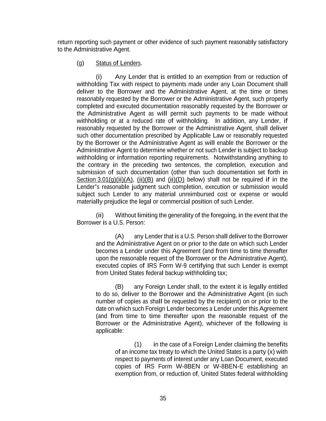 35 return reporting such payment or other evidence of such payment reasonably satisfactory to the Administrative Agent. (g) Status of Lenders. (i) Any Lender that is entitled to an exemption from or reduction of withholding Tax with respect to payments made under any Loan Document shall deliver to the Borrower and the Administrative Agent, at the time or times reasonably requested by the Borrower or the Administrative Agent, such properly completed and executed documentation reasonably requested by the Borrower or the Administrative Agent as will permit such payments to be made without withholding or at a reduced rate of withholding. In addition, any Lender, if reasonably requested by the Borrower or the Administrative Agent, shall deliver such other documentation prescribed by Applicable Law or reasonably requested by the Borrower or the Administrative Agent as will enable the Borrower or the Administrative Agent to determine whether or not such Lender is subject to backup withholding or information reporting requirements. Notwithstanding anything to the contrary in the preceding two sentences, the completion, execution and submission of such documentation (other than such documentation set forth in Section 3.01(g)(ii)(A), (ii)(B) and (ii)(D) below) shall not be required if in the Lender’s reasonable judgment such completion, execution or submission would subject such Lender to any material unreimbursed cost or expense or would materially prejudice the legal or commercial position of such Lender. (ii) Without limiting the generality of the foregoing, in the event that the Borrower is a U.S. Person: (A) any Lender that is a U.S. Person shall deliver to the Borrower and the Administrative Agent on or prior to the date on which such Lender becomes a Lender under this Agreement (and from time to time thereafter upon the reasonable request of the Borrower or the Administrative Agent), executed copies of IRS Form W-9 certifying that such Lender is exempt from United States federal backup withholding tax; (B) any Foreign Lender shall, to the extent it is legally entitled to do so, deliver to the Borrower and the Administrative Agent (in such number of copies as shall be requested by the recipient) on or prior to the date on which such Foreign Lender becomes a Lender under this Agreement (and from time to time thereafter upon the reasonable request of the Borrower or the Administrative Agent), whichever of the following is applicable: (1) in the case of a Foreign Lender claiming the benefits of an income tax treaty to which the United States is a party (x) with respect to payments of interest under any Loan Document, executed copies of IRS Form W-8BEN or W-8BEN-E establishing an exemption from, or reduction of, United States federal withholding