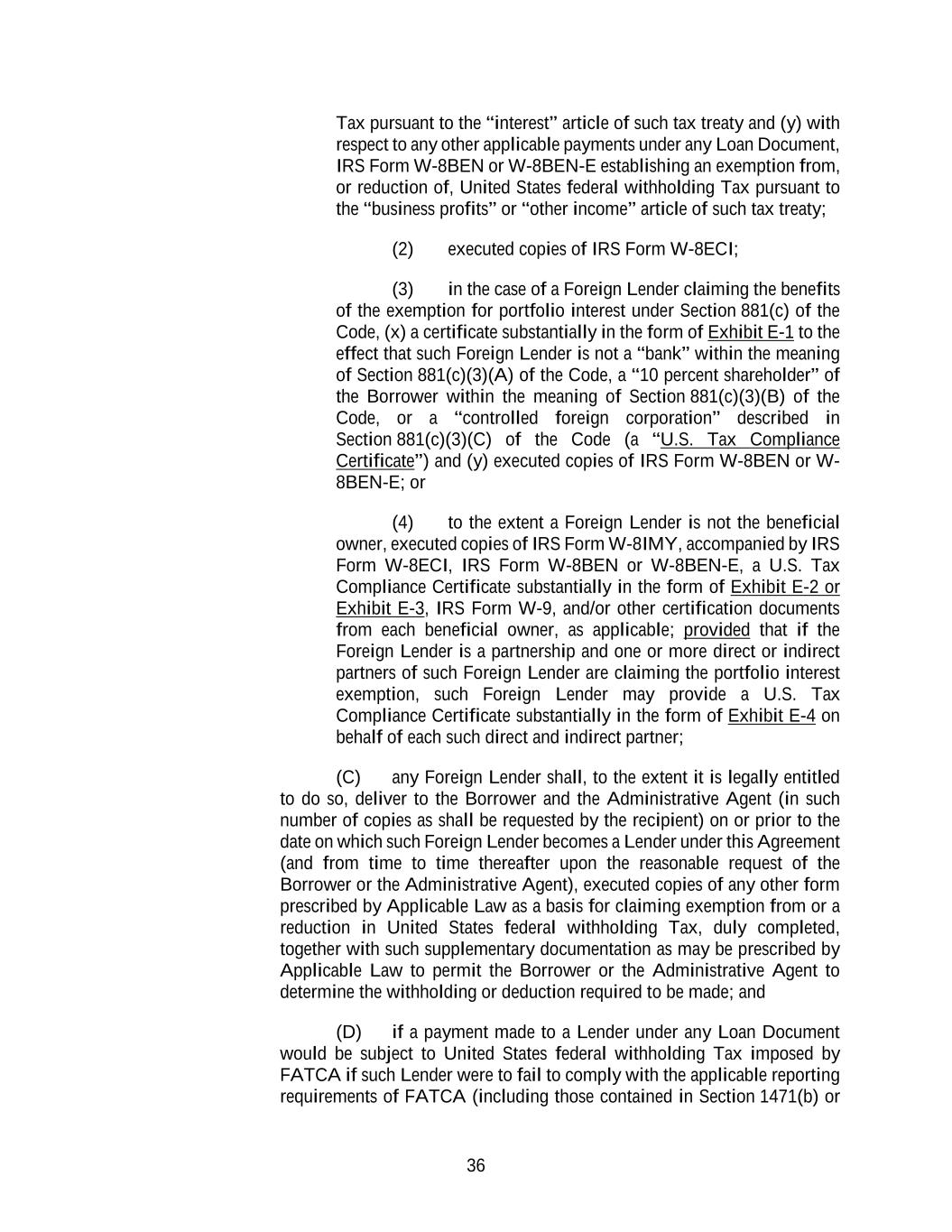 36 Tax pursuant to the “interest” article of such tax treaty and (y) with respect to any other applicable payments under any Loan Document, IRS Form W-8BEN or W-8BEN-E establishing an exemption from, or reduction of, United States federal withholding Tax pursuant to the “business profits” or “other income” article of such tax treaty; (2) executed copies of IRS Form W-8ECI; (3) in the case of a Foreign Lender claiming the benefits of the exemption for portfolio interest under Section 881(c) of the Code, (x) a certificate substantially in the form of Exhibit E-1 to the effect that such Foreign Lender is not a “bank” within the meaning of Section 881(c)(3)(A) of the Code, a “10 percent shareholder” of the Borrower within the meaning of Section 881(c)(3)(B) of the Code, or a “controlled foreign corporation” described in Section 881(c)(3)(C) of the Code (a “U.S. Tax Compliance Certificate”) and (y) executed copies of IRS Form W-8BEN or W- 8BEN-E; or (4) to the extent a Foreign Lender is not the beneficial owner, executed copies of IRS Form W-8IMY, accompanied by IRS Form W-8ECI, IRS Form W-8BEN or W-8BEN-E, a U.S. Tax Compliance Certificate substantially in the form of Exhibit E-2 or Exhibit E-3, IRS Form W-9, and/or other certification documents from each beneficial owner, as applicable; provided that if the Foreign Lender is a partnership and one or more direct or indirect partners of such Foreign Lender are claiming the portfolio interest exemption, such Foreign Lender may provide a U.S. Tax Compliance Certificate substantially in the form of Exhibit E-4 on behalf of each such direct and indirect partner; (C) any Foreign Lender shall, to the extent it is legally entitled to do so, deliver to the Borrower and the Administrative Agent (in such number of copies as shall be requested by the recipient) on or prior to the date on which such Foreign Lender becomes a Lender under this Agreement (and from time to time thereafter upon the reasonable request of the Borrower or the Administrative Agent), executed copies of any other form prescribed by Applicable Law as a basis for claiming exemption from or a reduction in United States federal withholding Tax, duly completed, together with such supplementary documentation as may be prescribed by Applicable Law to permit the Borrower or the Administrative Agent to determine the withholding or deduction required to be made; and (D) if a payment made to a Lender under any Loan Document would be subject to United States federal withholding Tax imposed by FATCA if such Lender were to fail to comply with the applicable reporting requirements of FATCA (including those contained in Section 1471(b) or