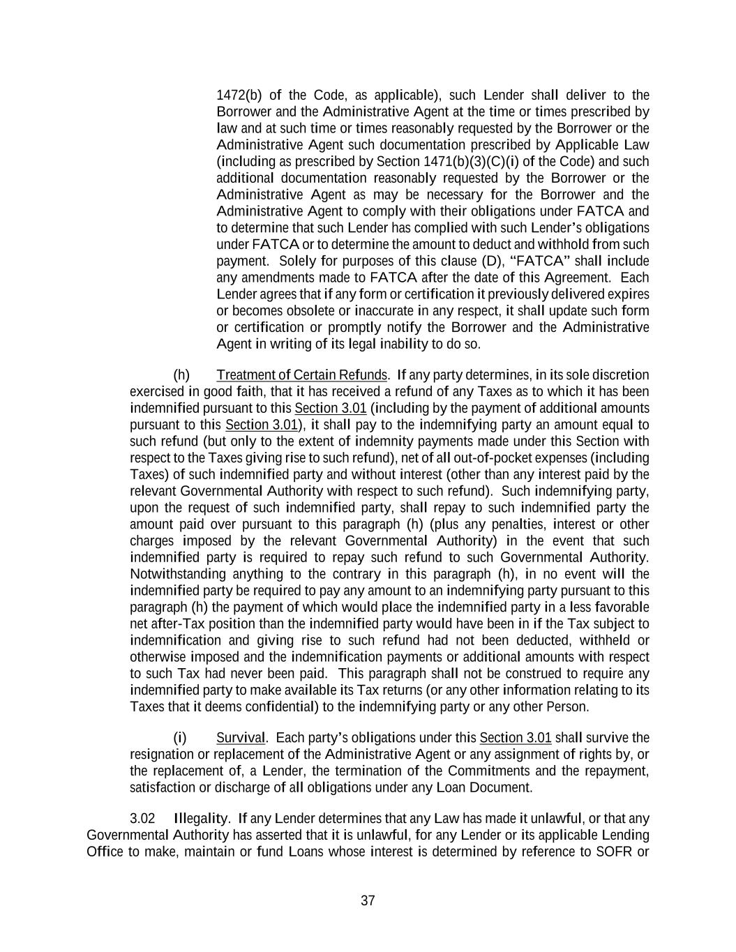 37 1472(b) of the Code, as applicable), such Lender shall deliver to the Borrower and the Administrative Agent at the time or times prescribed by law and at such time or times reasonably requested by the Borrower or the Administrative Agent such documentation prescribed by Applicable Law (including as prescribed by Section 1471(b)(3)(C)(i) of the Code) and such additional documentation reasonably requested by the Borrower or the Administrative Agent as may be necessary for the Borrower and the Administrative Agent to comply with their obligations under FATCA and to determine that such Lender has complied with such Lender’s obligations under FATCA or to determine the amount to deduct and withhold from such payment. Solely for purposes of this clause (D), “FATCA” shall include any amendments made to FATCA after the date of this Agreement. Each Lender agrees that if any form or certification it previously delivered expires or becomes obsolete or inaccurate in any respect, it shall update such form or certification or promptly notify the Borrower and the Administrative Agent in writing of its legal inability to do so. (h) Treatment of Certain Refunds. If any party determines, in its sole discretion exercised in good faith, that it has received a refund of any Taxes as to which it has been indemnified pursuant to this Section 3.01 (including by the payment of additional amounts pursuant to this Section 3.01), it shall pay to the indemnifying party an amount equal to such refund (but only to the extent of indemnity payments made under this Section with respect to the Taxes giving rise to such refund), net of all out-of-pocket expenses (including Taxes) of such indemnified party and without interest (other than any interest paid by the relevant Governmental Authority with respect to such refund). Such indemnifying party, upon the request of such indemnified party, shall repay to such indemnified party the amount paid over pursuant to this paragraph (h) (plus any penalties, interest or other charges imposed by the relevant Governmental Authority) in the event that such indemnified party is required to repay such refund to such Governmental Authority. Notwithstanding anything to the contrary in this paragraph (h), in no event will the indemnified party be required to pay any amount to an indemnifying party pursuant to this paragraph (h) the payment of which would place the indemnified party in a less favorable net after-Tax position than the indemnified party would have been in if the Tax subject to indemnification and giving rise to such refund had not been deducted, withheld or otherwise imposed and the indemnification payments or additional amounts with respect to such Tax had never been paid. This paragraph shall not be construed to require any indemnified party to make available its Tax returns (or any other information relating to its Taxes that it deems confidential) to the indemnifying party or any other Person. (i) Survival. Each party’s obligations under this Section 3.01 shall survive the resignation or replacement of the Administrative Agent or any assignment of rights by, or the replacement of, a Lender, the termination of the Commitments and the repayment, satisfaction or discharge of all obligations under any Loan Document. 3.02 Illegality. If any Lender determines that any Law has made it unlawful, or that any Governmental Authority has asserted that it is unlawful, for any Lender or its applicable Lending Office to make, maintain or fund Loans whose interest is determined by reference to SOFR or