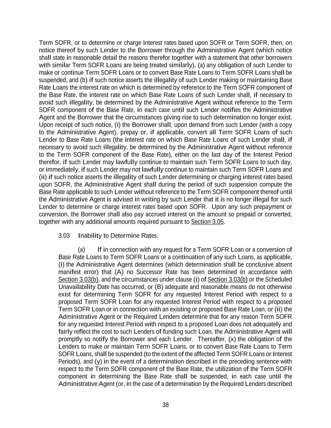 38 Term SOFR, or to determine or charge interest rates based upon SOFR or Term SOFR, then, on notice thereof by such Lender to the Borrower through the Administrative Agent (which notice shall state in reasonable detail the reasons therefor together with a statement that other borrowers with similar Term SOFR Loans are being treated similarly), (a) any obligation of such Lender to make or continue Term SOFR Loans or to convert Base Rate Loans to Term SOFR Loans shall be suspended, and (b) if such notice asserts the illegality of such Lender making or maintaining Base Rate Loans the interest rate on which is determined by reference to the Term SOFR component of the Base Rate, the interest rate on which Base Rate Loans of such Lender shall, if necessary to avoid such illegality, be determined by the Administrative Agent without reference to the Term SOFR component of the Base Rate, in each case until such Lender notifies the Administrative Agent and the Borrower that the circumstances giving rise to such determination no longer exist. Upon receipt of such notice, (i) the Borrower shall, upon demand from such Lender (with a copy to the Administrative Agent), prepay or, if applicable, convert all Term SOFR Loans of such Lender to Base Rate Loans (the interest rate on which Base Rate Loans of such Lender shall, if necessary to avoid such illegality, be determined by the Administrative Agent without reference to the Term SOFR component of the Base Rate), either on the last day of the Interest Period therefor, if such Lender may lawfully continue to maintain such Term SOFR Loans to such day, or immediately, if such Lender may not lawfully continue to maintain such Term SOFR Loans and (ii) if such notice asserts the illegality of such Lender determining or charging interest rates based upon SOFR, the Administrative Agent shall during the period of such suspension compute the Base Rate applicable to such Lender without reference to the Term SOFR component thereof until the Administrative Agent is advised in writing by such Lender that it is no longer illegal for such Lender to determine or charge interest rates based upon SOFR. Upon any such prepayment or conversion, the Borrower shall also pay accrued interest on the amount so prepaid or converted, together with any additional amounts required pursuant to Section 3.05. 3.03 Inability to Determine Rates. (a) If in connection with any request for a Term SOFR Loan or a conversion of Base Rate Loans to Term SOFR Loans or a continuation of any such Loans, as applicable, (i) the Administrative Agent determines (which determination shall be conclusive absent manifest error) that (A) no Successor Rate has been determined in accordance with Section 3.03(b), and the circumstances under clause (i) of Section 3.03(b) or the Scheduled Unavailability Date has occurred, or (B) adequate and reasonable means do not otherwise exist for determining Term SOFR for any requested Interest Period with respect to a proposed Term SOFR Loan for any requested Interest Period with respect to a proposed Term SOFR Loan or in connection with an existing or proposed Base Rate Loan, or (ii) the Administrative Agent or the Required Lenders determine that for any reason Term SOFR for any requested Interest Period with respect to a proposed Loan does not adequately and fairly reflect the cost to such Lenders of funding such Loan, the Administrative Agent will promptly so notify the Borrower and each Lender. Thereafter, (x) the obligation of the Lenders to make or maintain Term SOFR Loans, or to convert Base Rate Loans to Term SOFR Loans, shall be suspended (to the extent of the affected Term SOFR Loans or Interest Periods), and (y) in the event of a determination described in the preceding sentence with respect to the Term SOFR component of the Base Rate, the utilization of the Term SOFR component in determining the Base Rate shall be suspended, in each case until the Administrative Agent (or, in the case of a determination by the Required Lenders described