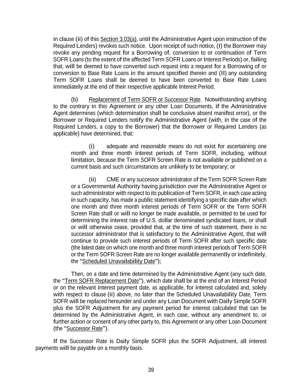 39 in clause (ii) of this Section 3.03(a), until the Administrative Agent upon instruction of the Required Lenders) revokes such notice. Upon receipt of such notice, (I) the Borrower may revoke any pending request for a Borrowing of, conversion to or continuation of Term SOFR Loans (to the extent of the affected Term SOFR Loans or Interest Periods) or, failing that, will be deemed to have converted such request into a request for a Borrowing of or conversion to Base Rate Loans in the amount specified therein and (II) any outstanding Term SOFR Loans shall be deemed to have been converted to Base Rate Loans immediately at the end of their respective applicable Interest Period. (b) Replacement of Term SOFR or Successor Rate. Notwithstanding anything to the contrary in this Agreement or any other Loan Documents, if the Administrative Agent determines (which determination shall be conclusive absent manifest error), or the Borrower or Required Lenders notify the Administrative Agent (with, in the case of the Required Lenders, a copy to the Borrower) that the Borrower or Required Lenders (as applicable) have determined, that: (i) adequate and reasonable means do not exist for ascertaining one month and three month interest periods of Term SOFR, including, without limitation, because the Term SOFR Screen Rate is not available or published on a current basis and such circumstances are unlikely to be temporary; or (ii) CME or any successor administrator of the Term SOFR Screen Rate or a Governmental Authority having jurisdiction over the Administrative Agent or such administrator with respect to its publication of Term SOFR, in each case acting in such capacity, has made a public statement identifying a specific date after which one month and three month interest periods of Term SOFR or the Term SOFR Screen Rate shall or will no longer be made available, or permitted to be used for determining the interest rate of U.S. dollar denominated syndicated loans, or shall or will otherwise cease, provided that, at the time of such statement, there is no successor administrator that is satisfactory to the Administrative Agent, that will continue to provide such interest periods of Term SOFR after such specific date (the latest date on which one month and three month interest periods of Term SOFR or the Term SOFR Screen Rate are no longer available permanently or indefinitely, the “Scheduled Unavailability Date”); Then, on a date and time determined by the Administrative Agent (any such date, the “Term SOFR Replacement Date”), which date shall be at the end of an Interest Period or on the relevant interest payment date, as applicable, for interest calculated and, solely with respect to clause (ii) above, no later than the Scheduled Unavailability Date, Term SOFR will be replaced hereunder and under any Loan Document with Daily Simple SOFR plus the SOFR Adjustment for any payment period for interest calculated that can be determined by the Administrative Agent, in each case, without any amendment to, or further action or consent of any other party to, this Agreement or any other Loan Document (the “Successor Rate”). If the Successor Rate is Daily Simple SOFR plus the SOFR Adjustment, all interest payments will be payable on a monthly basis.