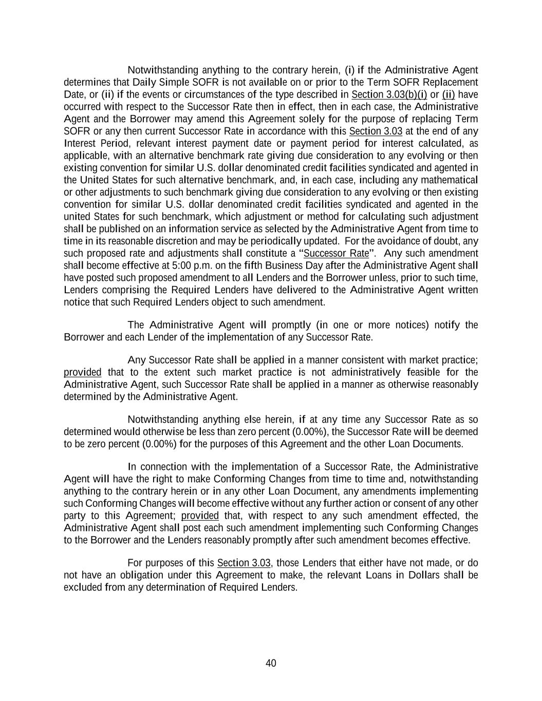 40 Notwithstanding anything to the contrary herein, (i) if the Administrative Agent determines that Daily Simple SOFR is not available on or prior to the Term SOFR Replacement Date, or (ii) if the events or circumstances of the type described in Section 3.03(b)(i) or (ii) have occurred with respect to the Successor Rate then in effect, then in each case, the Administrative Agent and the Borrower may amend this Agreement solely for the purpose of replacing Term SOFR or any then current Successor Rate in accordance with this Section 3.03 at the end of any Interest Period, relevant interest payment date or payment period for interest calculated, as applicable, with an alternative benchmark rate giving due consideration to any evolving or then existing convention for similar U.S. dollar denominated credit facilities syndicated and agented in the United States for such alternative benchmark, and, in each case, including any mathematical or other adjustments to such benchmark giving due consideration to any evolving or then existing convention for similar U.S. dollar denominated credit facilities syndicated and agented in the united States for such benchmark, which adjustment or method for calculating such adjustment shall be published on an information service as selected by the Administrative Agent from time to time in its reasonable discretion and may be periodically updated. For the avoidance of doubt, any such proposed rate and adjustments shall constitute a “Successor Rate”. Any such amendment shall become effective at 5:00 p.m. on the fifth Business Day after the Administrative Agent shall have posted such proposed amendment to all Lenders and the Borrower unless, prior to such time, Lenders comprising the Required Lenders have delivered to the Administrative Agent written notice that such Required Lenders object to such amendment. The Administrative Agent will promptly (in one or more notices) notify the Borrower and each Lender of the implementation of any Successor Rate. Any Successor Rate shall be applied in a manner consistent with market practice; provided that to the extent such market practice is not administratively feasible for the Administrative Agent, such Successor Rate shall be applied in a manner as otherwise reasonably determined by the Administrative Agent. Notwithstanding anything else herein, if at any time any Successor Rate as so determined would otherwise be less than zero percent (0.00%), the Successor Rate will be deemed to be zero percent (0.00%) for the purposes of this Agreement and the other Loan Documents. In connection with the implementation of a Successor Rate, the Administrative Agent will have the right to make Conforming Changes from time to time and, notwithstanding anything to the contrary herein or in any other Loan Document, any amendments implementing such Conforming Changes will become effective without any further action or consent of any other party to this Agreement; provided that, with respect to any such amendment effected, the Administrative Agent shall post each such amendment implementing such Conforming Changes to the Borrower and the Lenders reasonably promptly after such amendment becomes effective. For purposes of this Section 3.03, those Lenders that either have not made, or do not have an obligation under this Agreement to make, the relevant Loans in Dollars shall be excluded from any determination of Required Lenders.