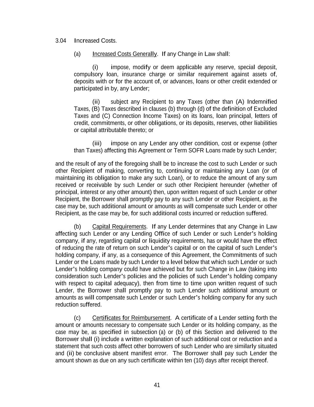 41 3.04 Increased Costs. (a) Increased Costs Generally. If any Change in Law shall: (i) impose, modify or deem applicable any reserve, special deposit, compulsory loan, insurance charge or similar requirement against assets of, deposits with or for the account of, or advances, loans or other credit extended or participated in by, any Lender; (ii) subject any Recipient to any Taxes (other than (A) Indemnified Taxes, (B) Taxes described in clauses (b) through (d) of the definition of Excluded Taxes and (C) Connection Income Taxes) on its loans, loan principal, letters of credit, commitments, or other obligations, or its deposits, reserves, other liabilities or capital attributable thereto; or (iii) impose on any Lender any other condition, cost or expense (other than Taxes) affecting this Agreement or Term SOFR Loans made by such Lender; and the result of any of the foregoing shall be to increase the cost to such Lender or such other Recipient of making, converting to, continuing or maintaining any Loan (or of maintaining its obligation to make any such Loan), or to reduce the amount of any sum received or receivable by such Lender or such other Recipient hereunder (whether of principal, interest or any other amount) then, upon written request of such Lender or other Recipient, the Borrower shall promptly pay to any such Lender or other Recipient, as the case may be, such additional amount or amounts as will compensate such Lender or other Recipient, as the case may be, for such additional costs incurred or reduction suffered. (b) Capital Requirements. If any Lender determines that any Change in Law affecting such Lender or any Lending Office of such Lender or such Lender’s holding company, if any, regarding capital or liquidity requirements, has or would have the effect of reducing the rate of return on such Lender’s capital or on the capital of such Lender’s holding company, if any, as a consequence of this Agreement, the Commitments of such Lender or the Loans made by such Lender to a level below that which such Lender or such Lender’s holding company could have achieved but for such Change in Law (taking into consideration such Lender’s policies and the policies of such Lender’s holding company with respect to capital adequacy), then from time to time upon written request of such Lender, the Borrower shall promptly pay to such Lender such additional amount or amounts as will compensate such Lender or such Lender’s holding company for any such reduction suffered. (c) Certificates for Reimbursement. A certificate of a Lender setting forth the amount or amounts necessary to compensate such Lender or its holding company, as the case may be, as specified in subsection (a) or (b) of this Section and delivered to the Borrower shall (i) include a written explanation of such additional cost or reduction and a statement that such costs affect other borrowers of such Lender who are similarly situated and (ii) be conclusive absent manifest error. The Borrower shall pay such Lender the amount shown as due on any such certificate within ten (10) days after receipt thereof.